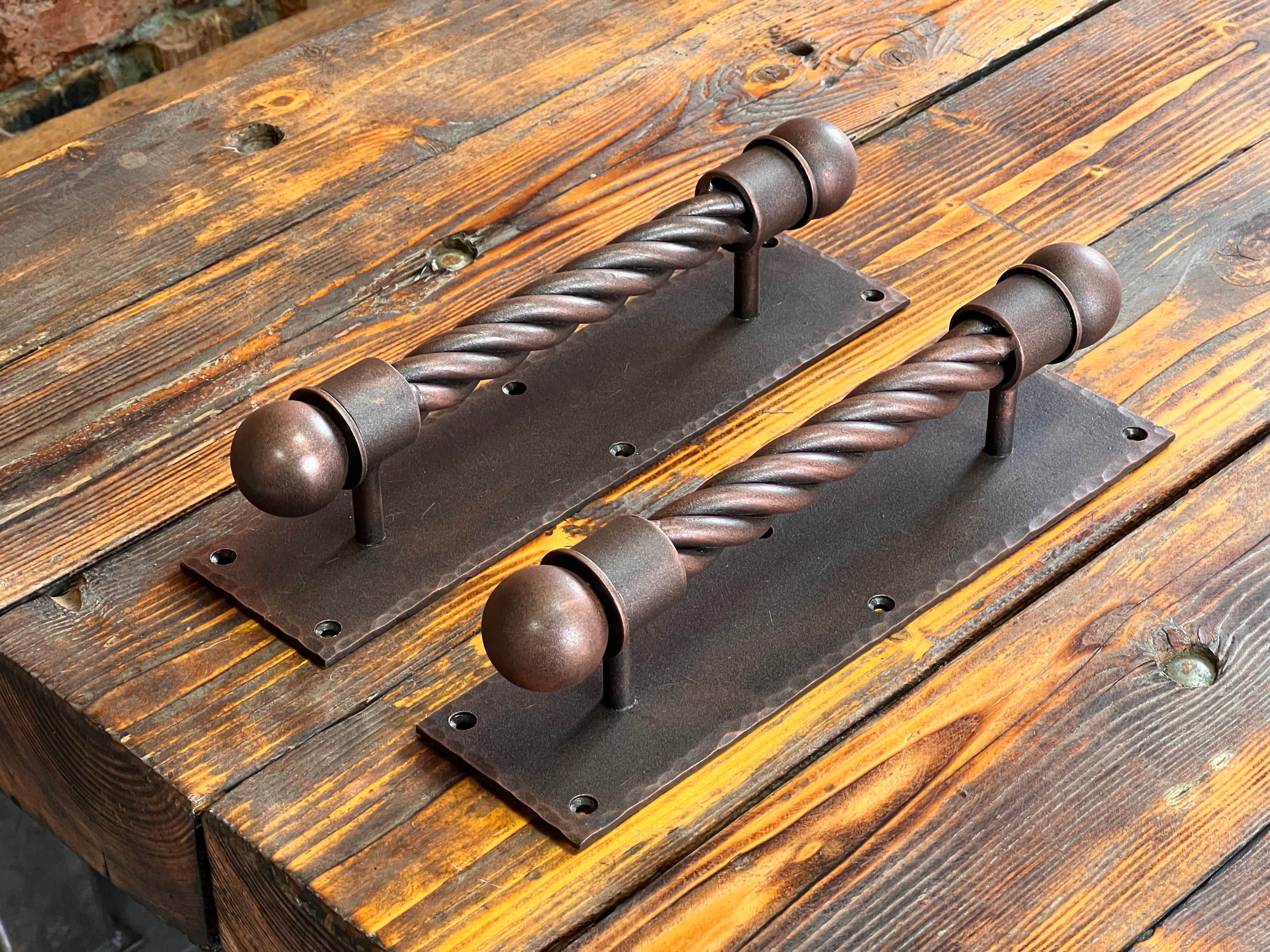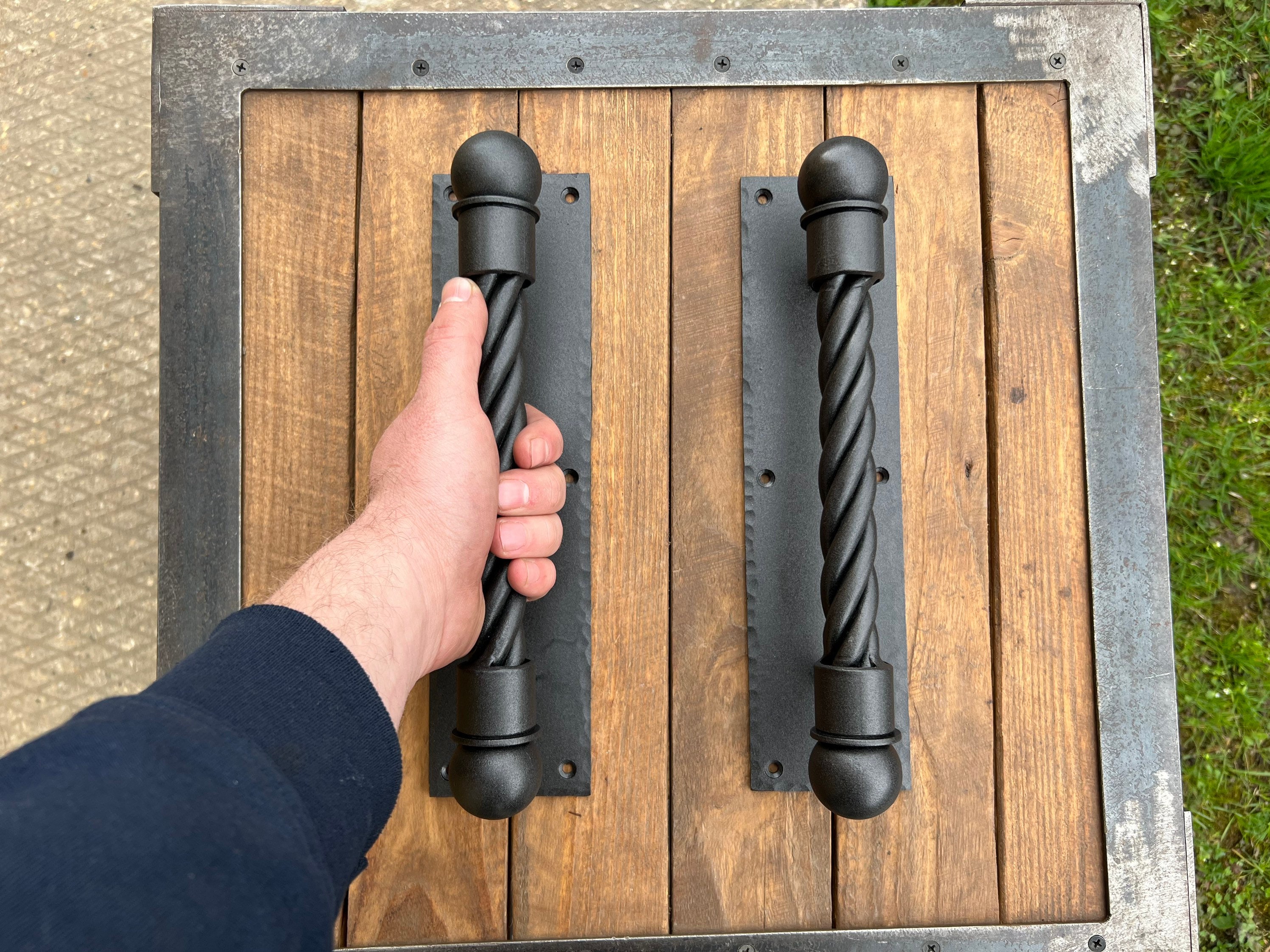 "New Model 12\". Set of two Massive iron door handles. Barn door pulls. Door hardware. Wro...