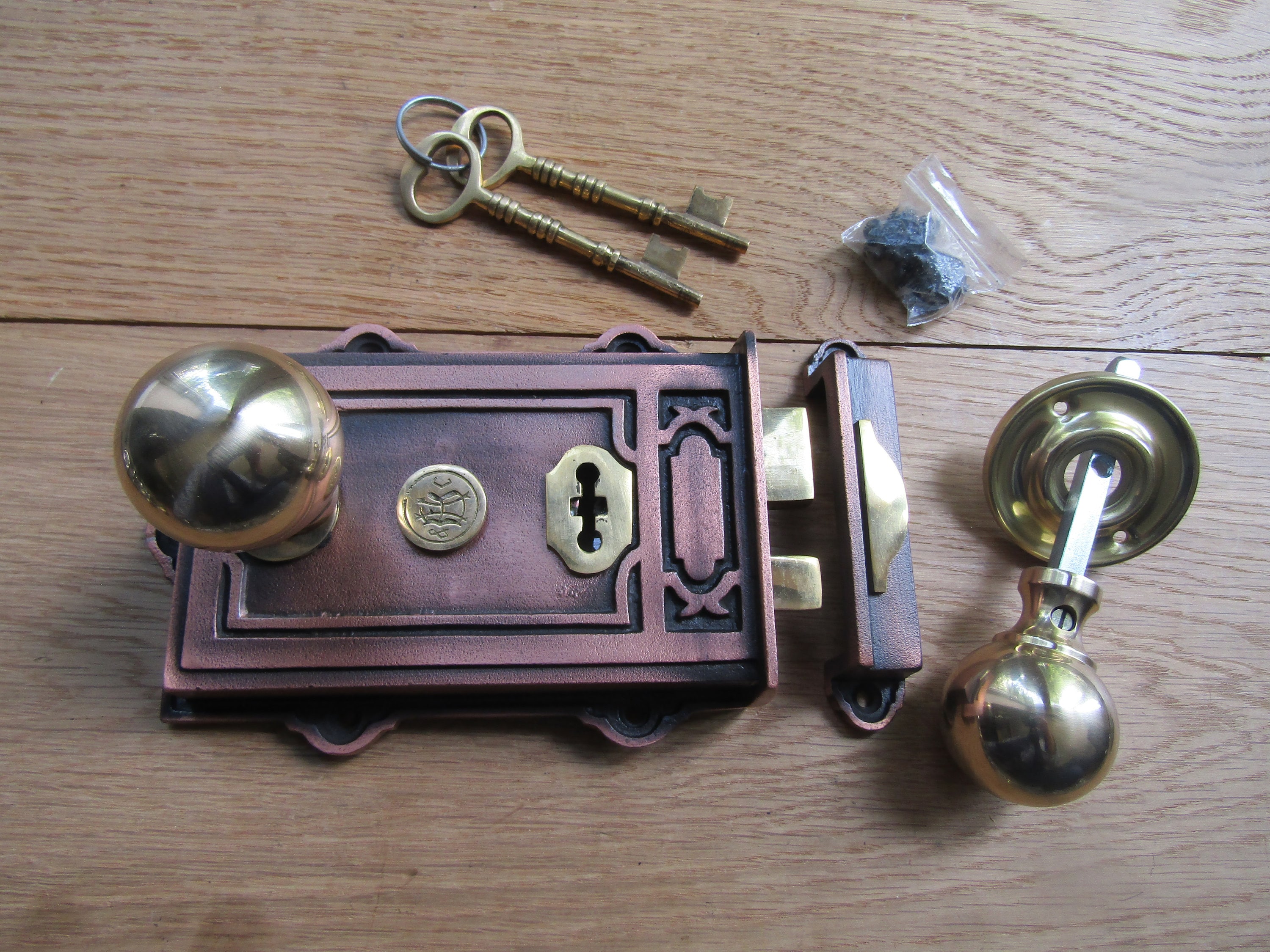 "Cast iron lock set with forged brass door knobs Knobs Available in polished brass or Antique c...
