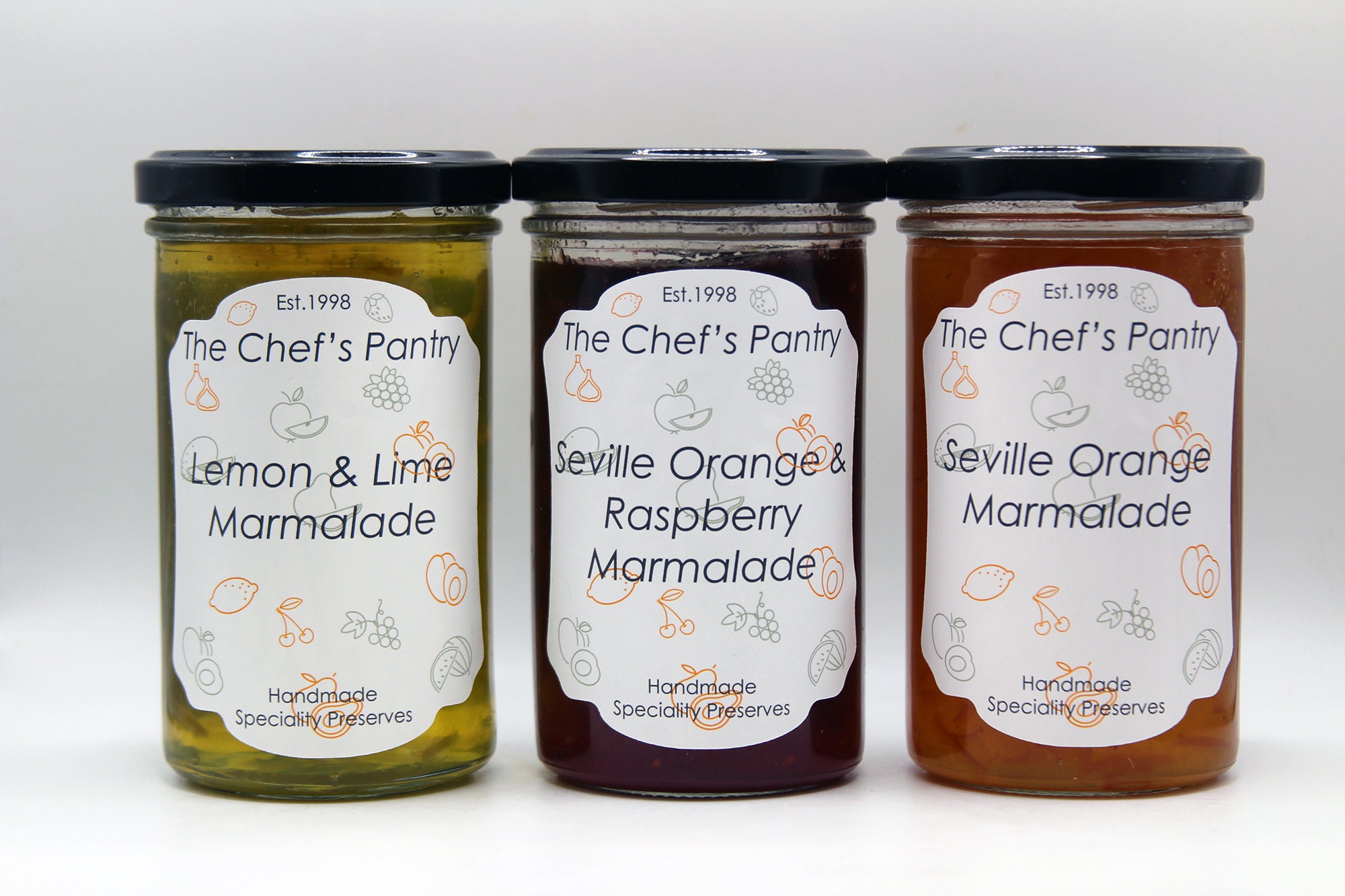 A set of 3 Jars of Marmalade Lemon & Lime Marmalade Orange & Raspberry Marmalade Seville Ora...