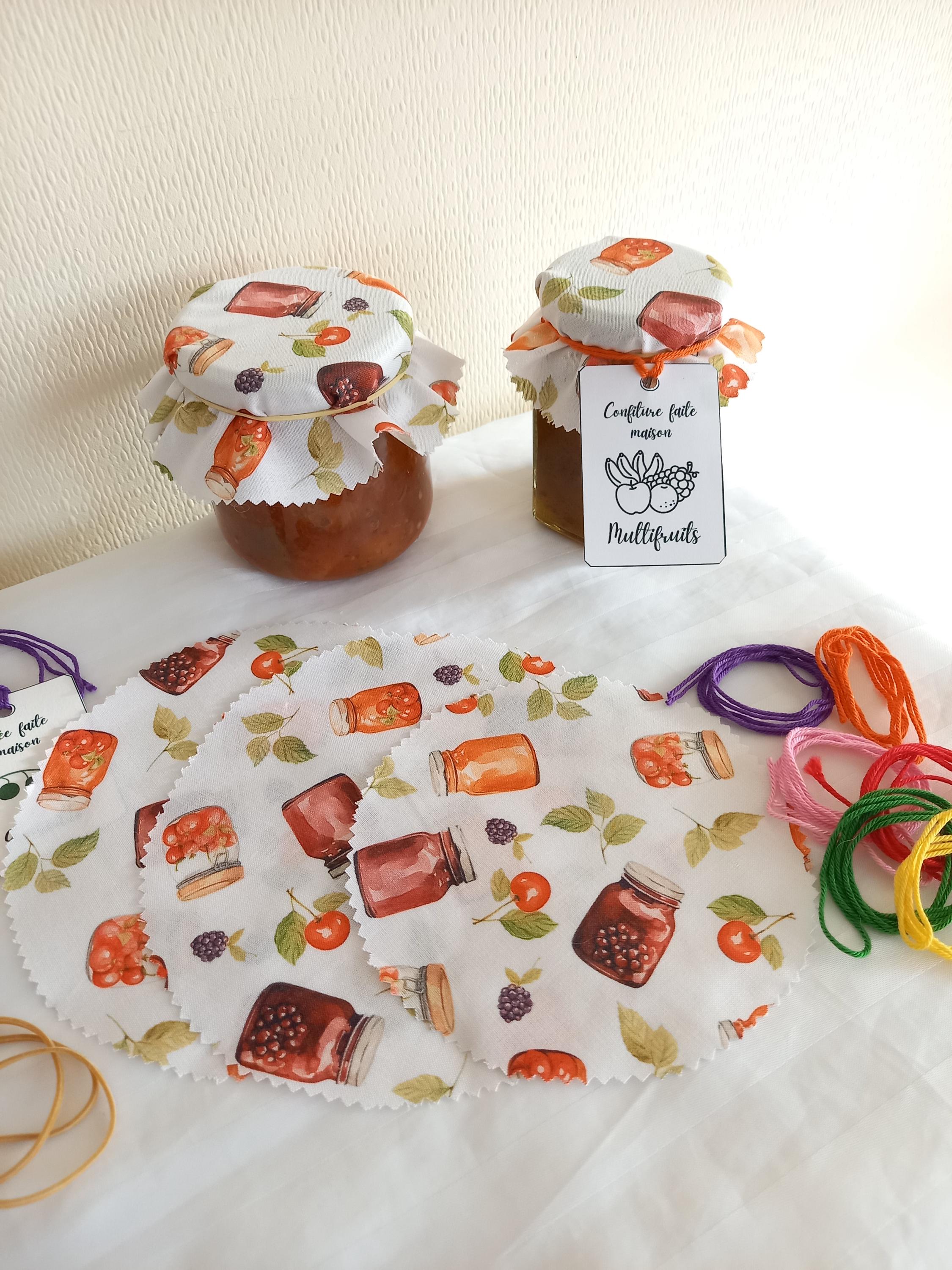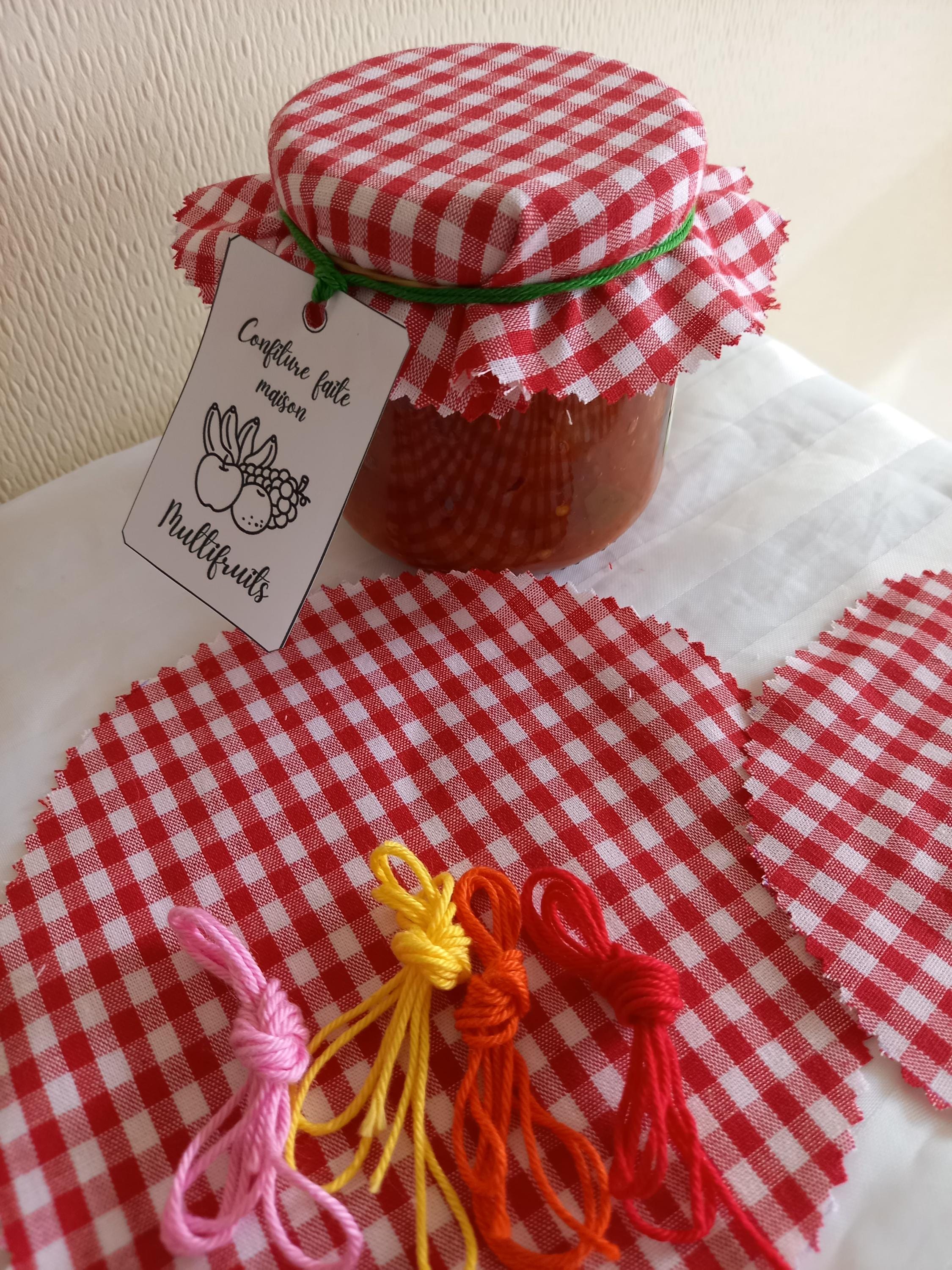 Jam jar cover X 3, fabric with jam jars, with ties, labels, elastic...