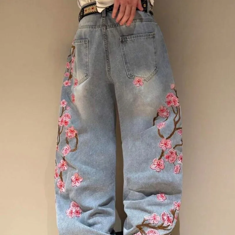 Harajuku Patchwork Cherry Blossom Embroidery Denim Pants Y2K Vintage Women Baggy Straight Wide Leg J...