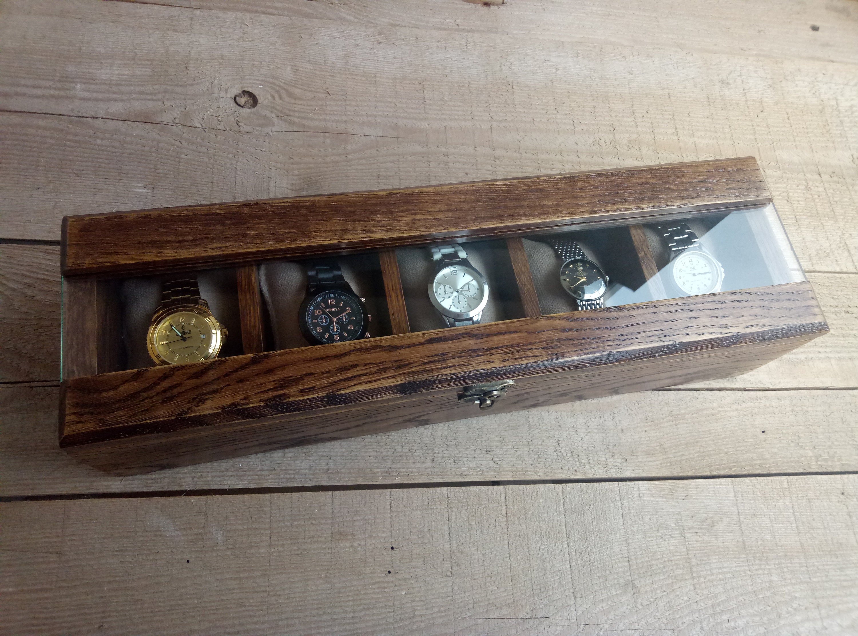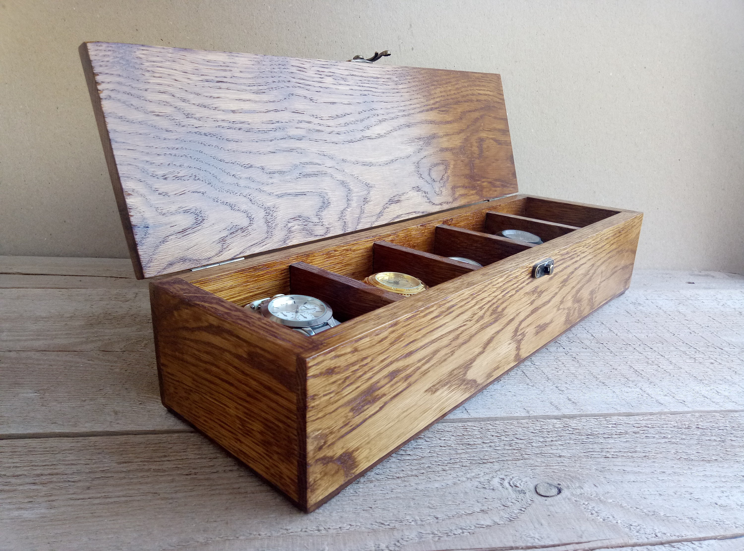 Wooden box for handmade watches. Made from oak wood. It is treated with natural dye and water-based ...
