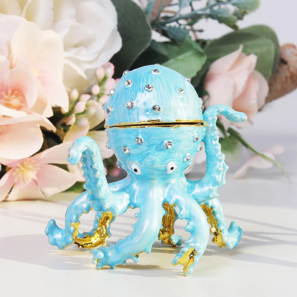 Blue Octopus Trinket Box Hinged Rhinestone Bejeweled Hand-Painted Ring Holder Colorful Enamel Ring B...