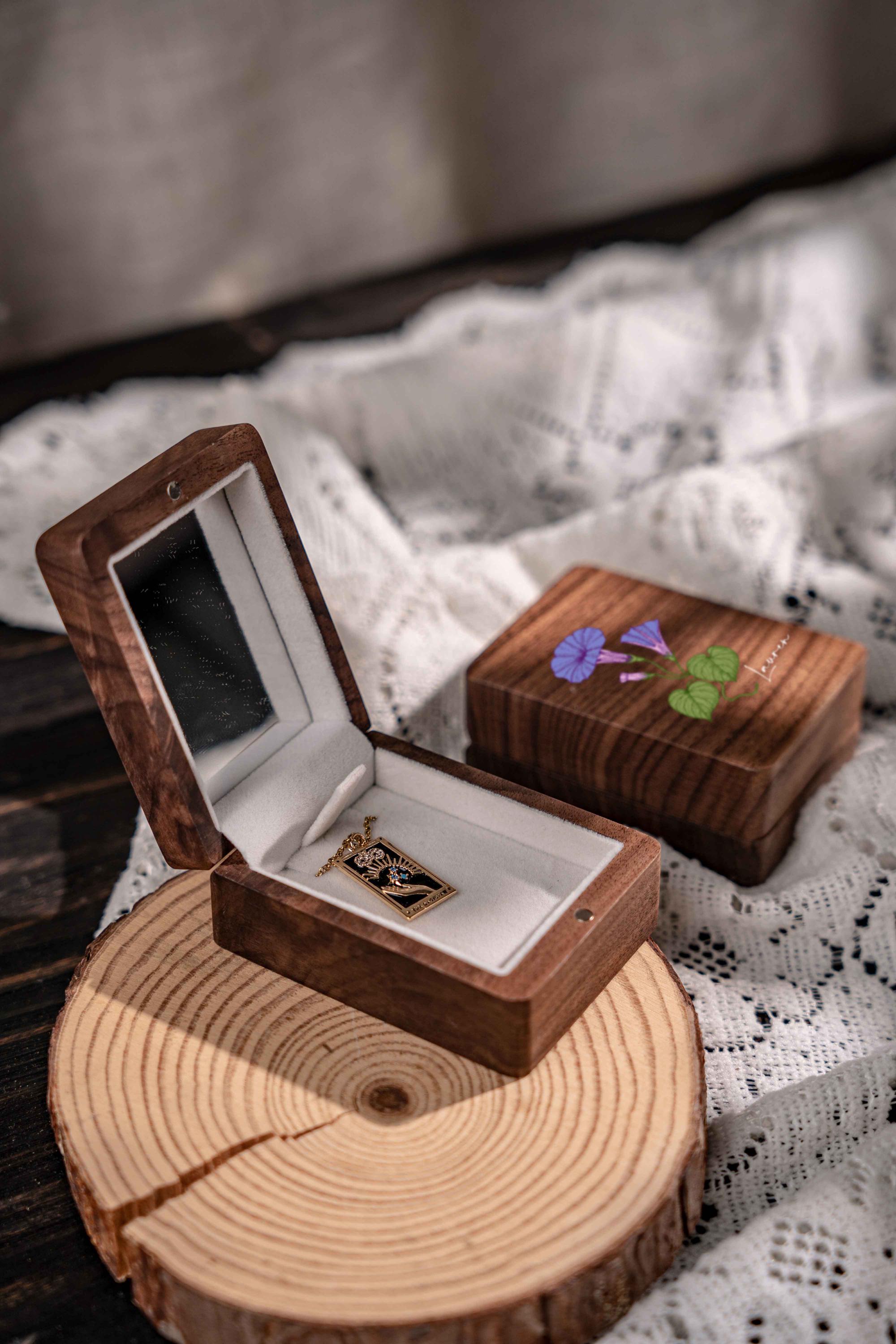 features. Engagement Necklace Box made of wood with wood grain on it, simple and vintage. Matches yo...