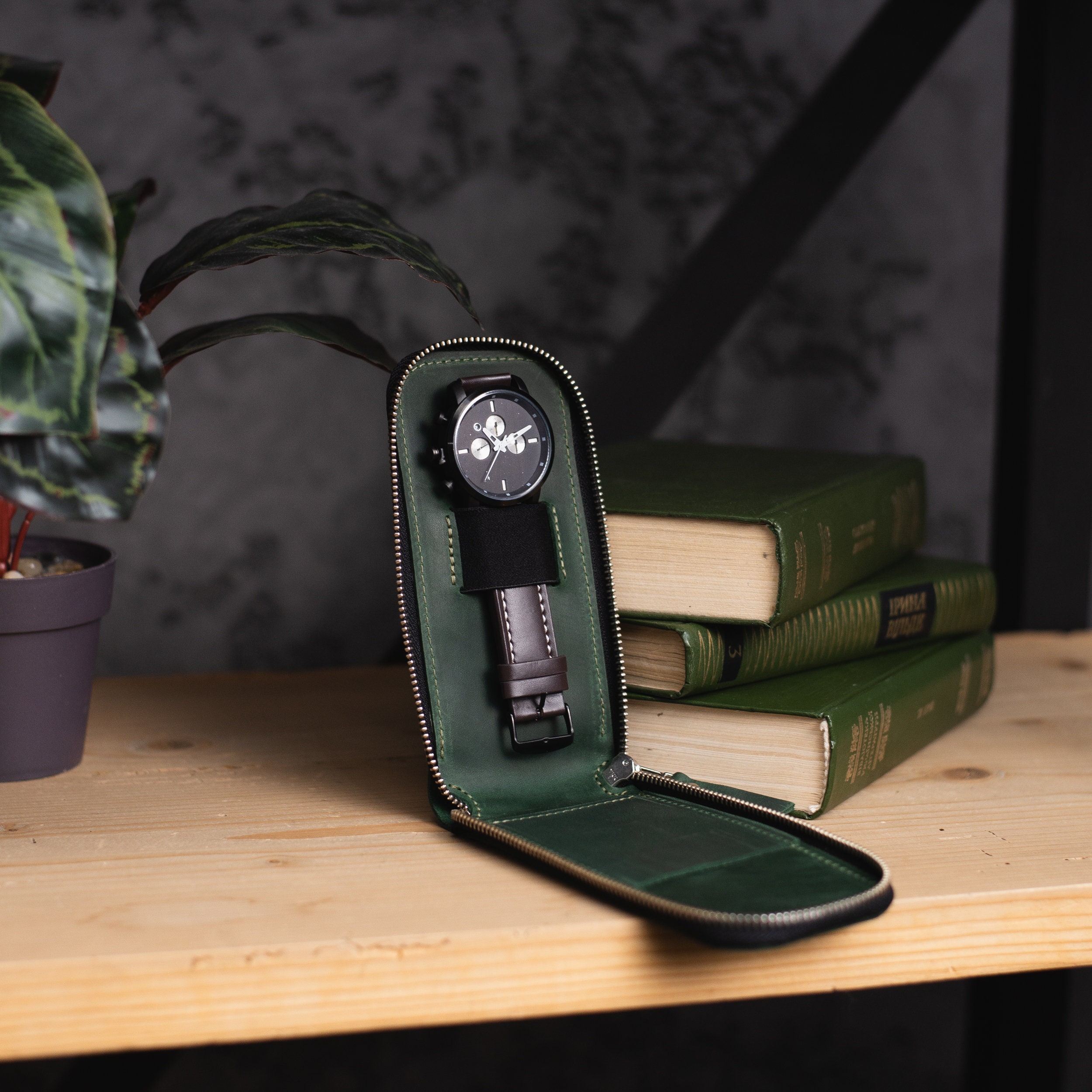 Personalized Green Weave Leather Watch Case, Vegan Leather Watch Ca...