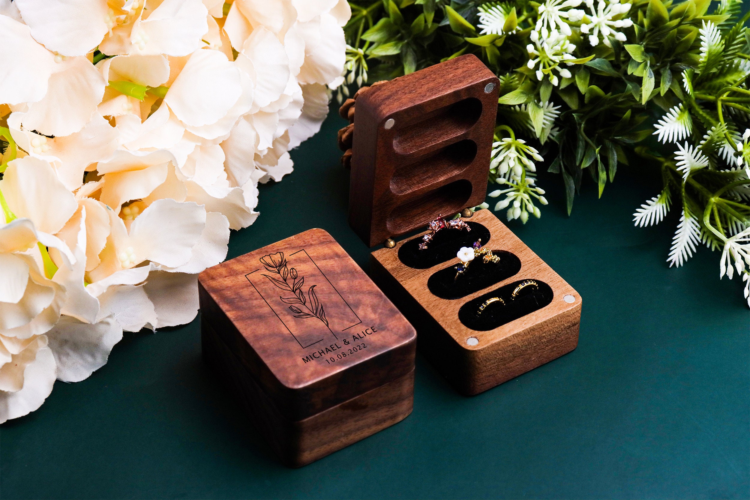 Custom Wedding Ring Box, Triple Ring Wooden Ring Box, Engagement Ri...