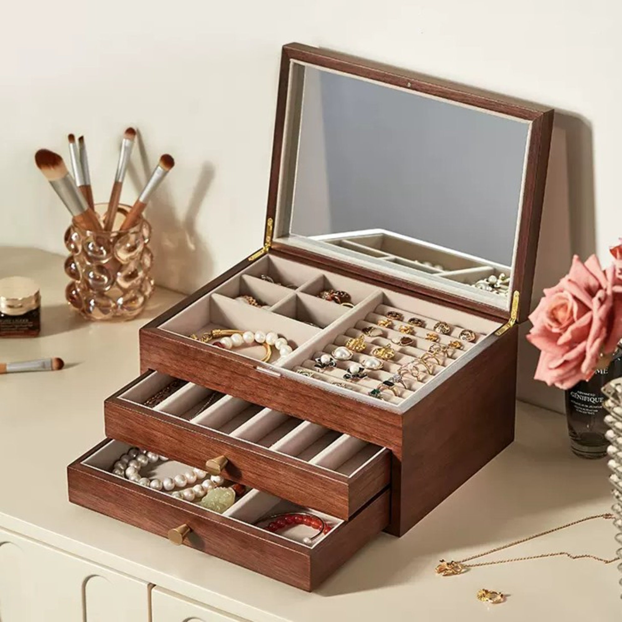 3 Layers One-way mirror Glass cover Wooden Jewelry Box Organizer,La...