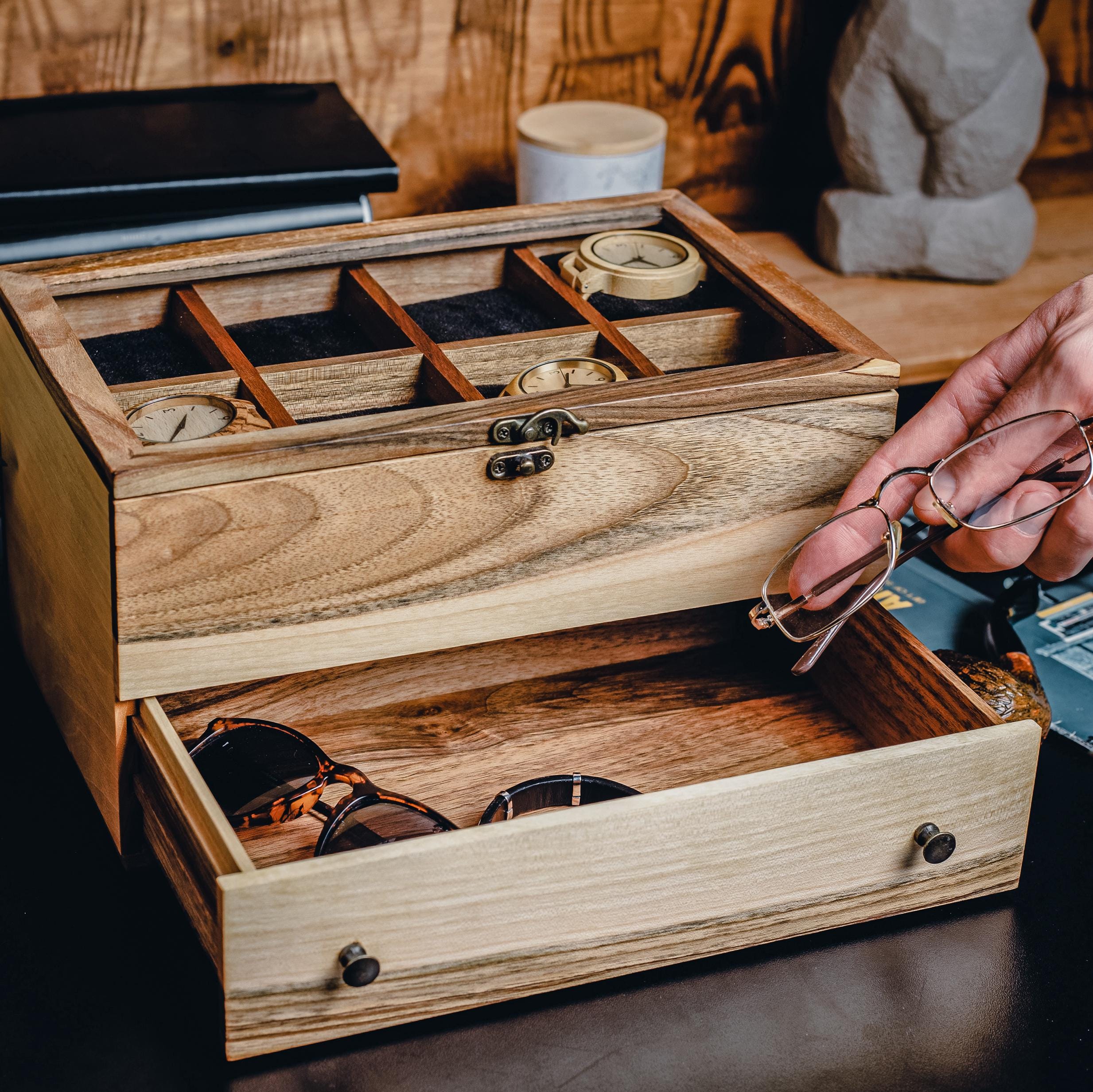 Sunglasses display case, Wooden compartments, Glasses display tray,...