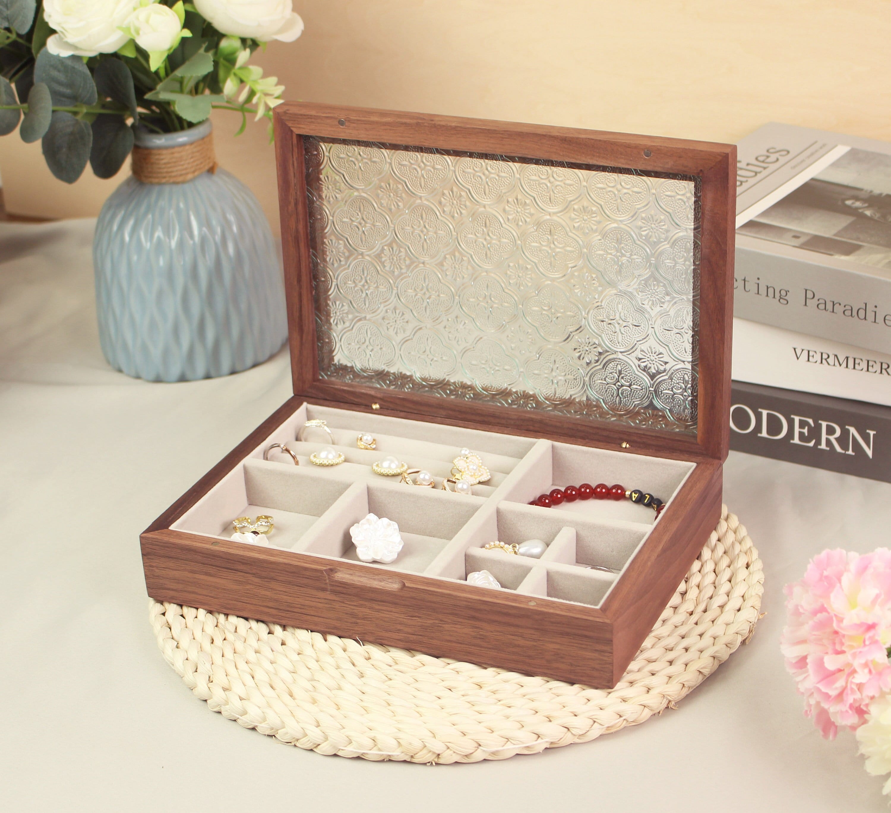 Vintage Solid Wood Large Jewelry Box with Glass Lid - Earring Bracelet Necklace Ring Storage Boxes T...