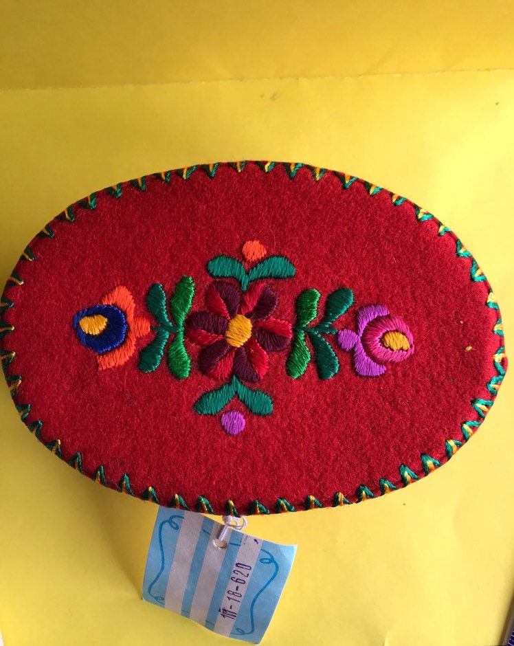 "Vintage hand embroidered red wool felt oval trinket box. Perfect for gift giving or keeping to...
