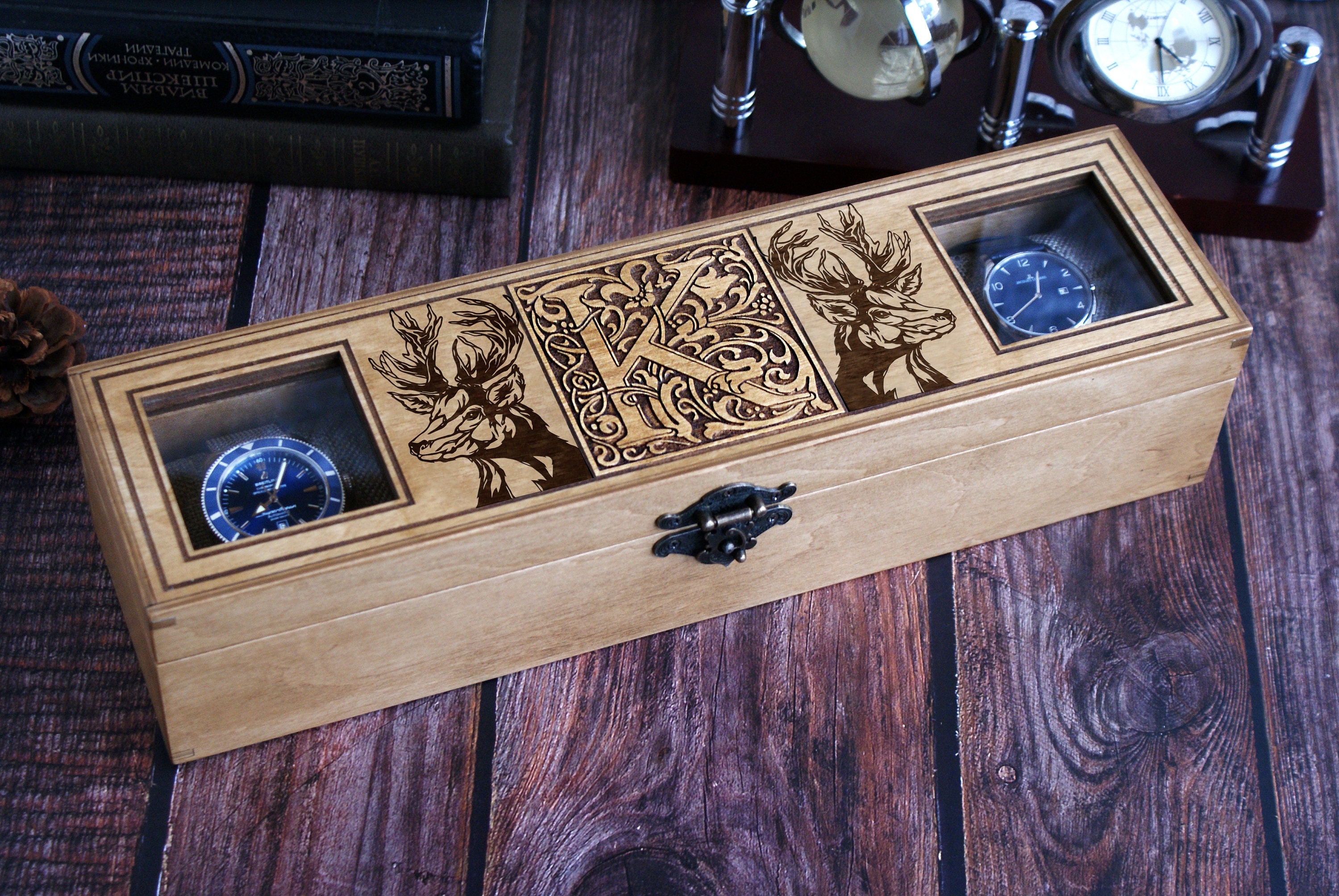 Vintage Deer Design, personalized box for 4 watches, handmade custo...
