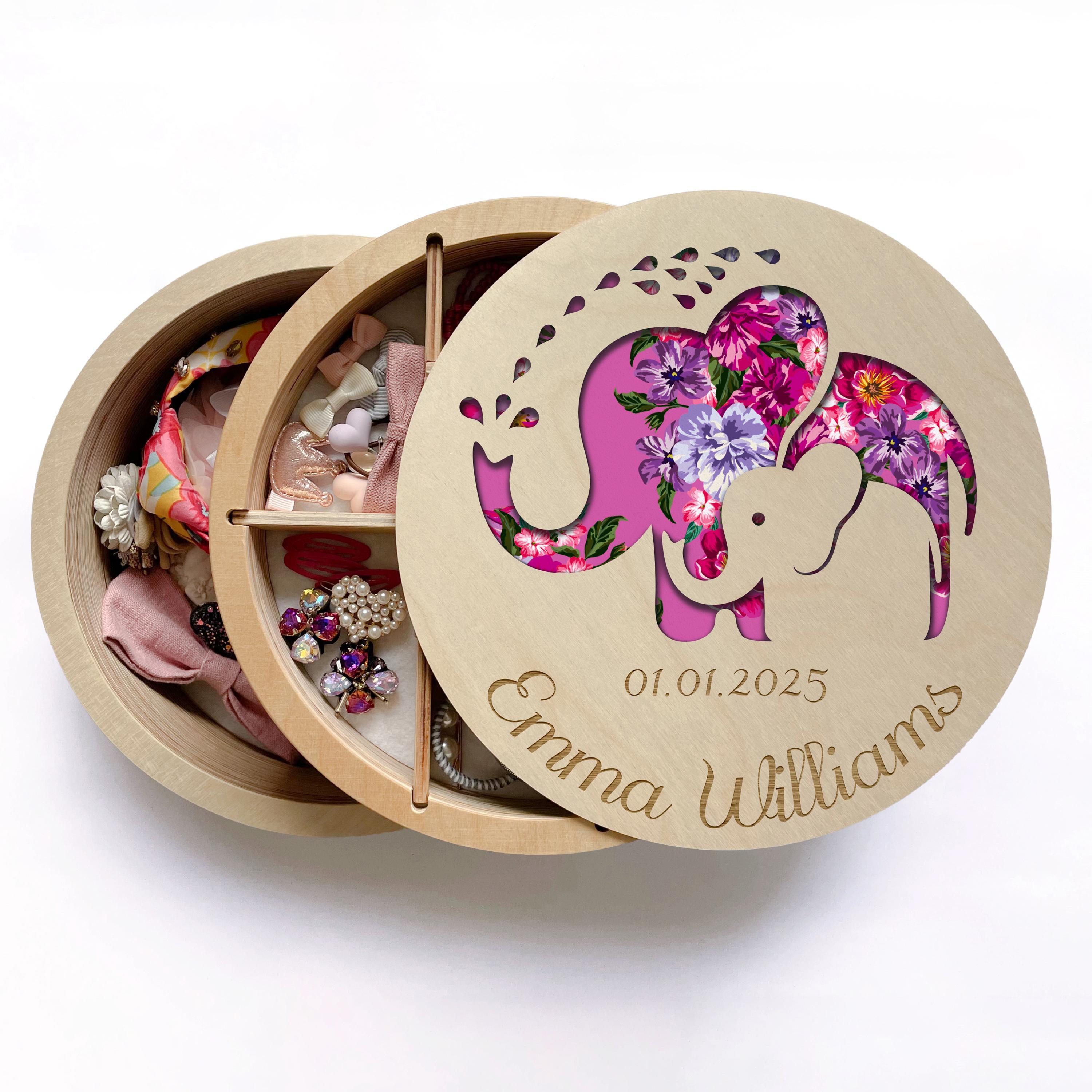 "Elephant Wooden Baby Jewelry Box from GuthmannGifts! How fun is this pretty round wooden baby ...