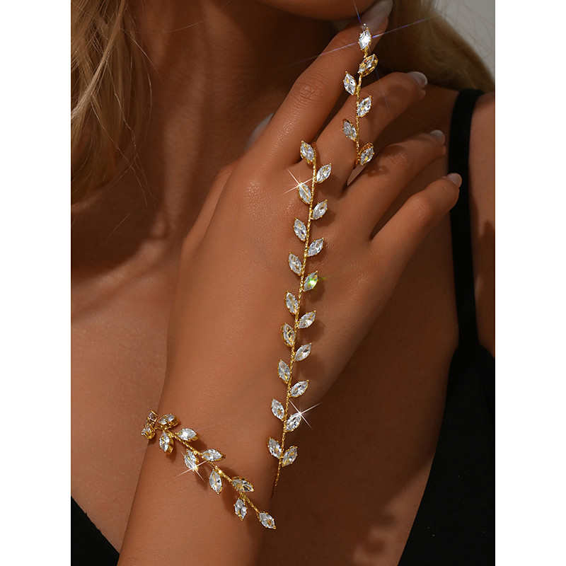 Women's Gold Leaf Crystal Bracelet and Ring Set - Elegant Rhineston...