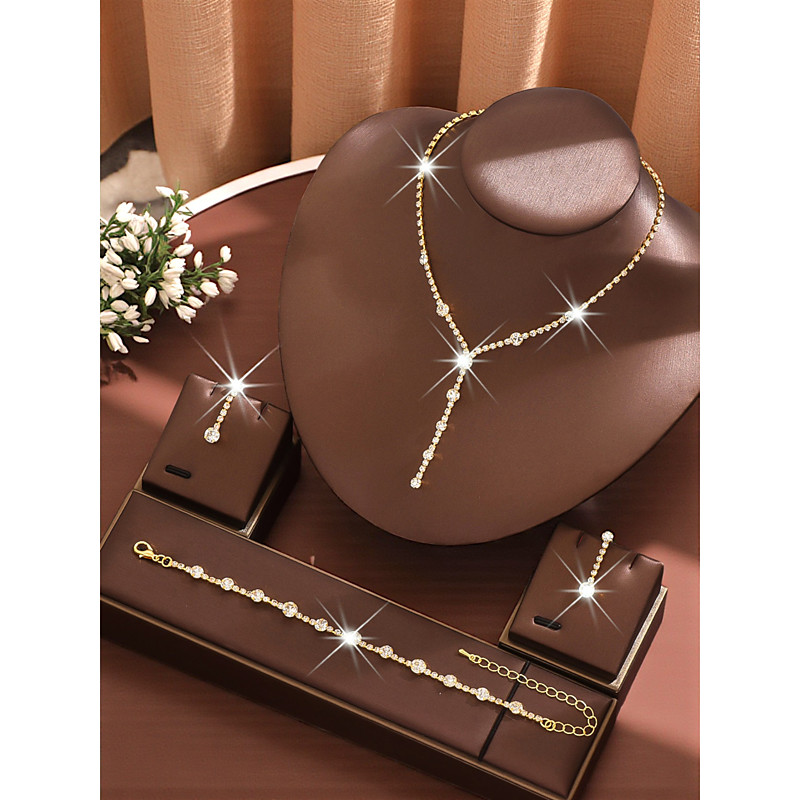 Women's Gold Rhinestone Jewelry Set - Elegant Y-Shaped Necklace, Da...