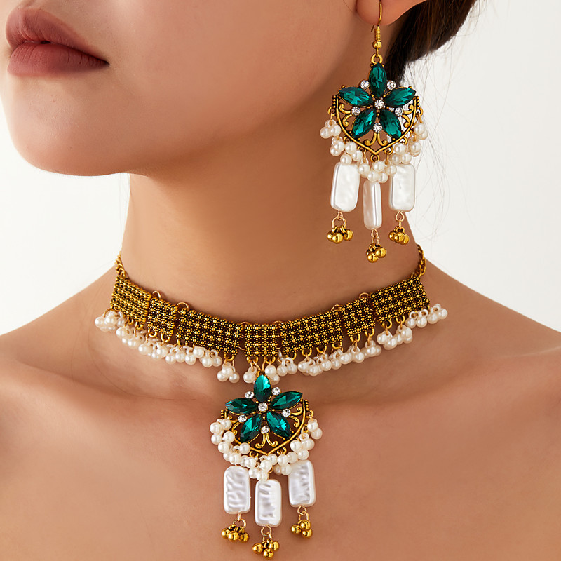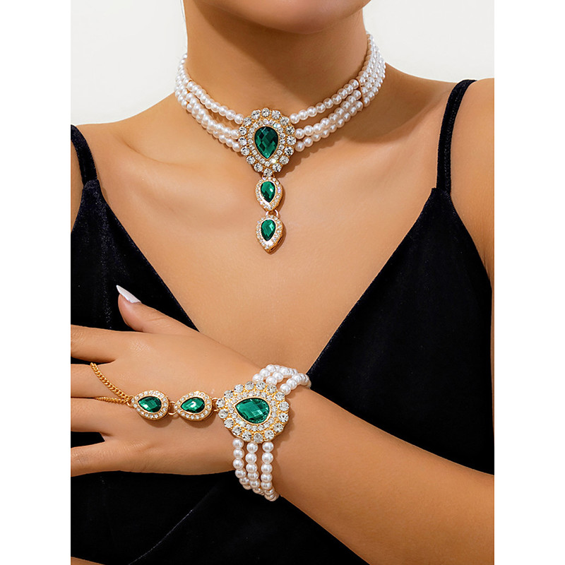 Women's Pearl and Emerald Jewelry Set - Elegant Rhinestone Choker N...