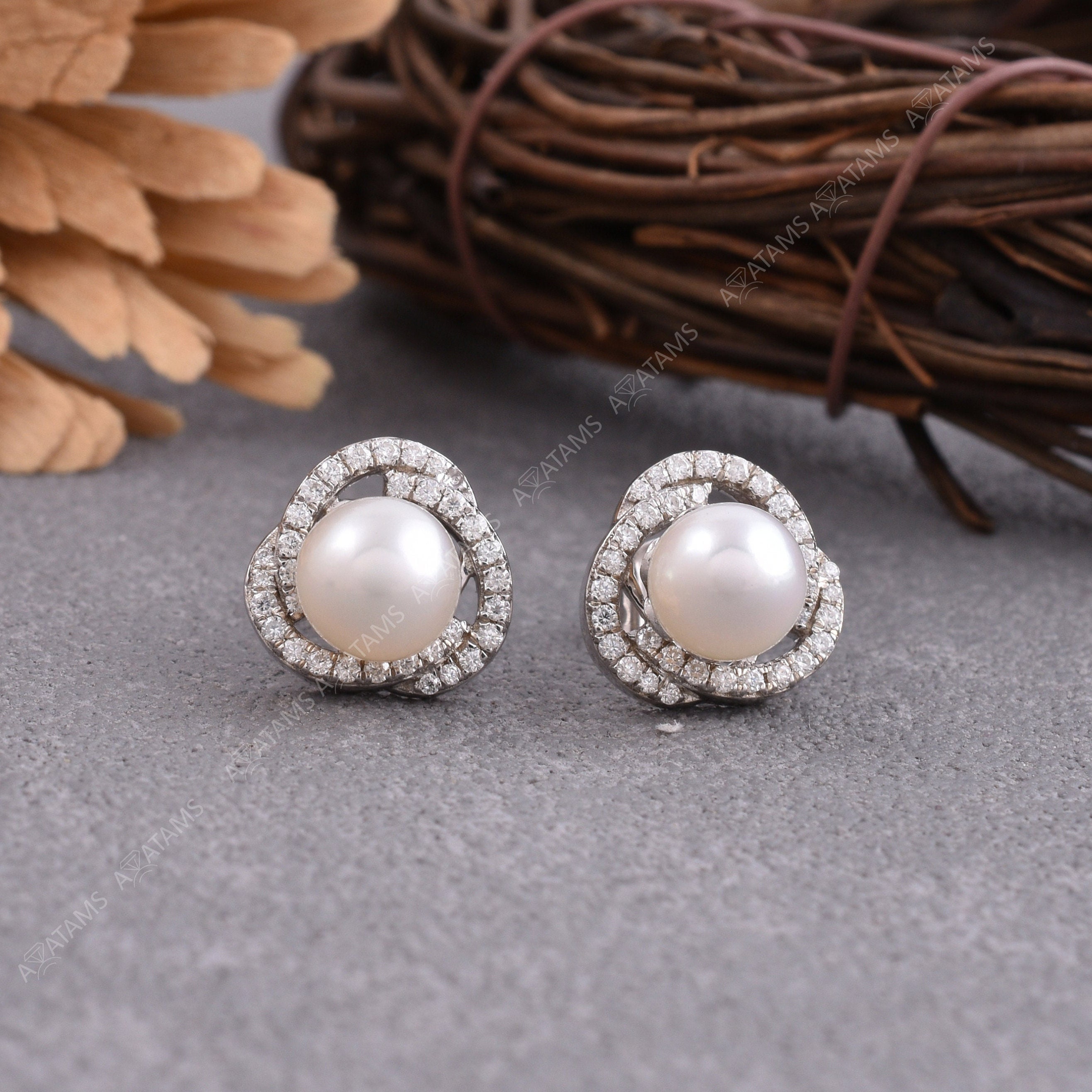 Pearl Halo Stud Floral Earring Jacket | Fusion Pearl Earrings in 925 Sterling Silver | Diamond Earri...