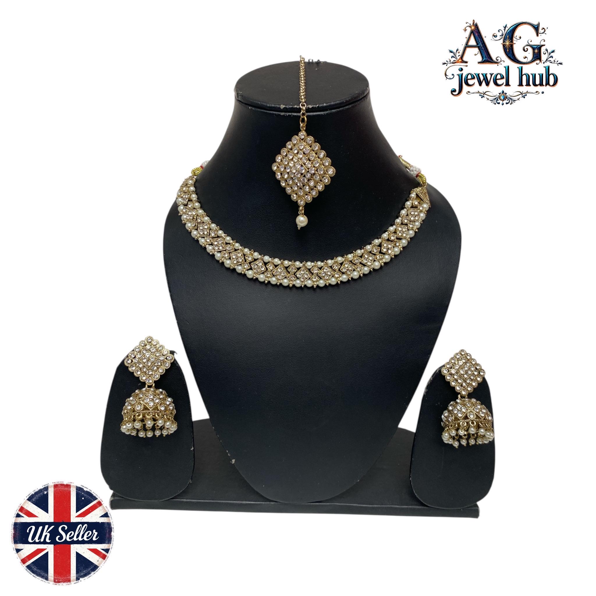 Asian Necklace set earrings tikka, Indian bridal gold with white co...