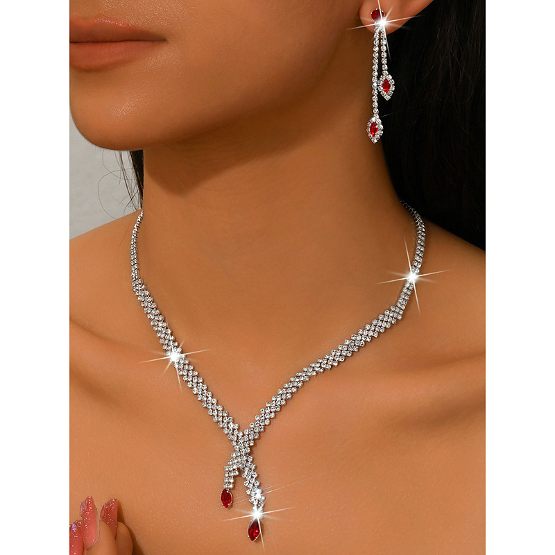 Women's Silver-Tone Necklace and Earring Set with Red Gemstone Acce...
