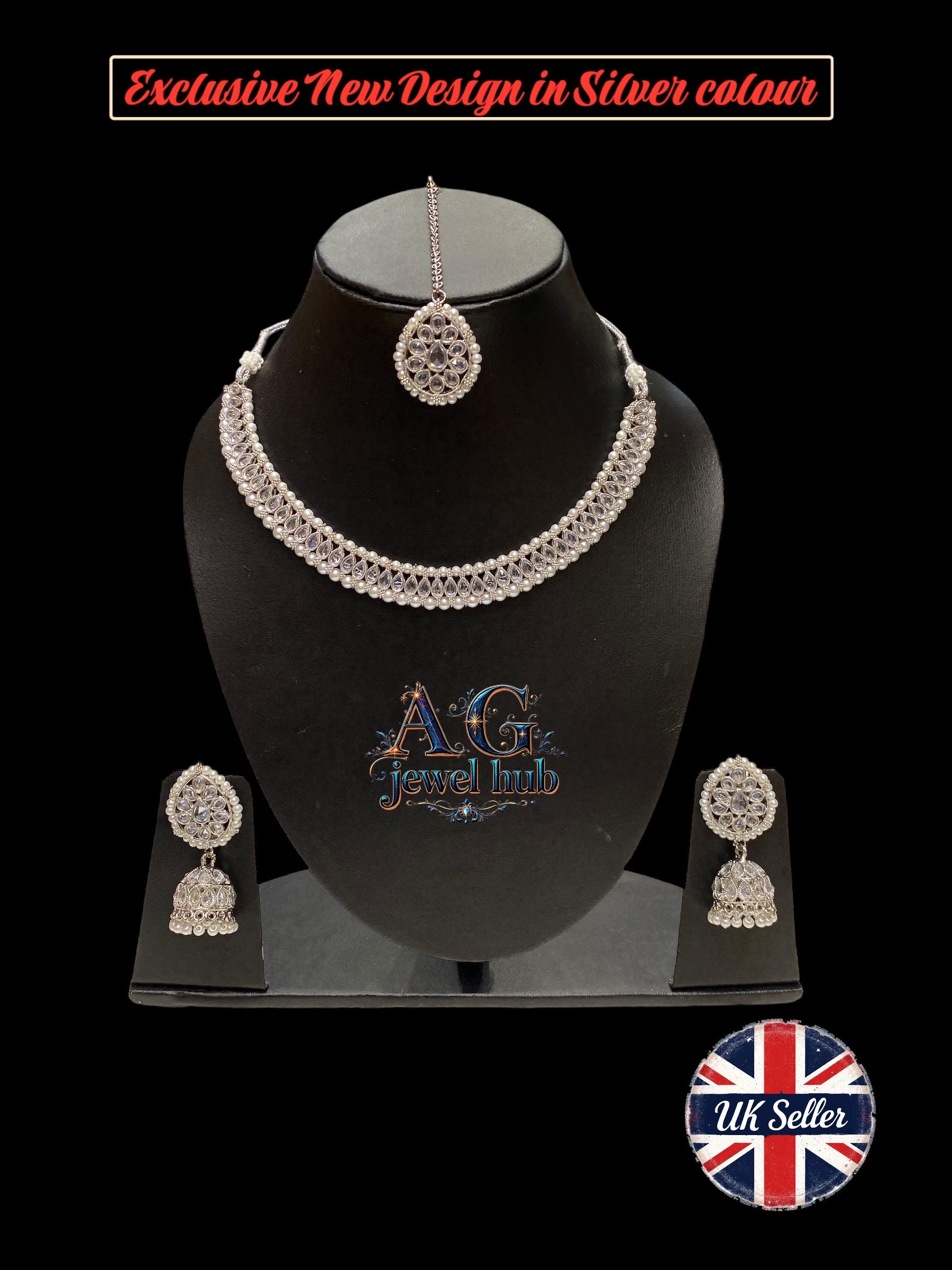 Asian Necklace set earrings tikka, Indian bridal SILVER colour with...