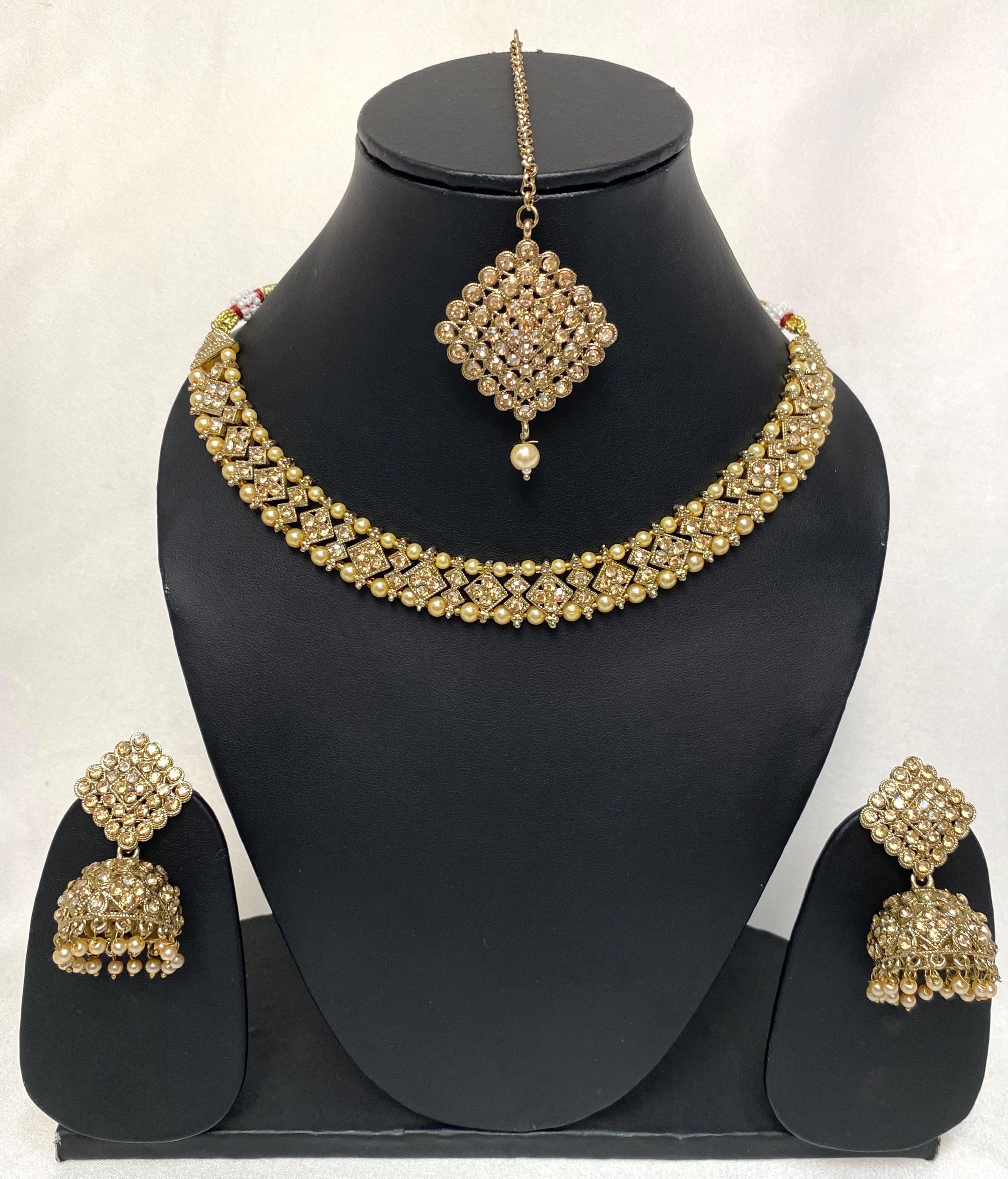 Asian Necklace set earrings tikka, Indian bridal gold colour with z...