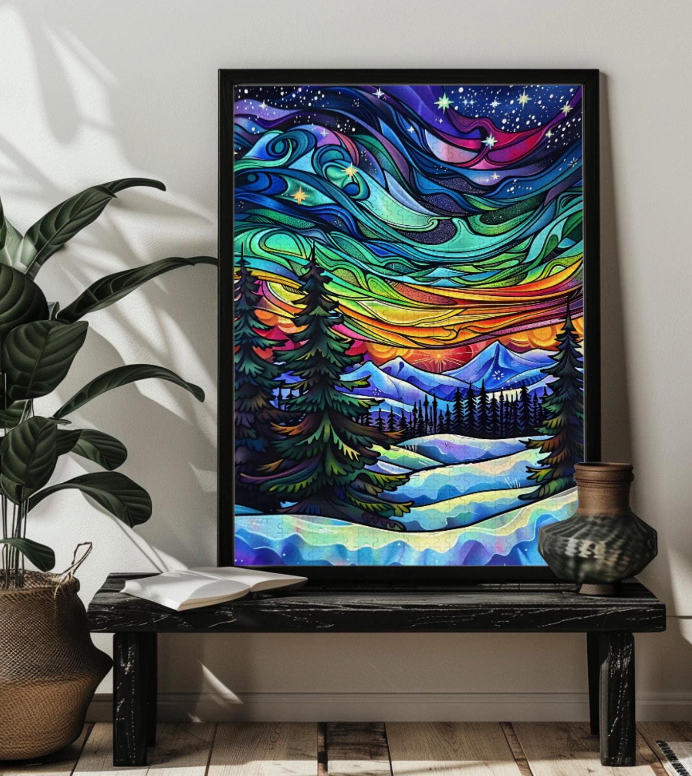 Stained Glass Northern Lights Jigsaw Puzzle Art Gift,Forest Aurora ...