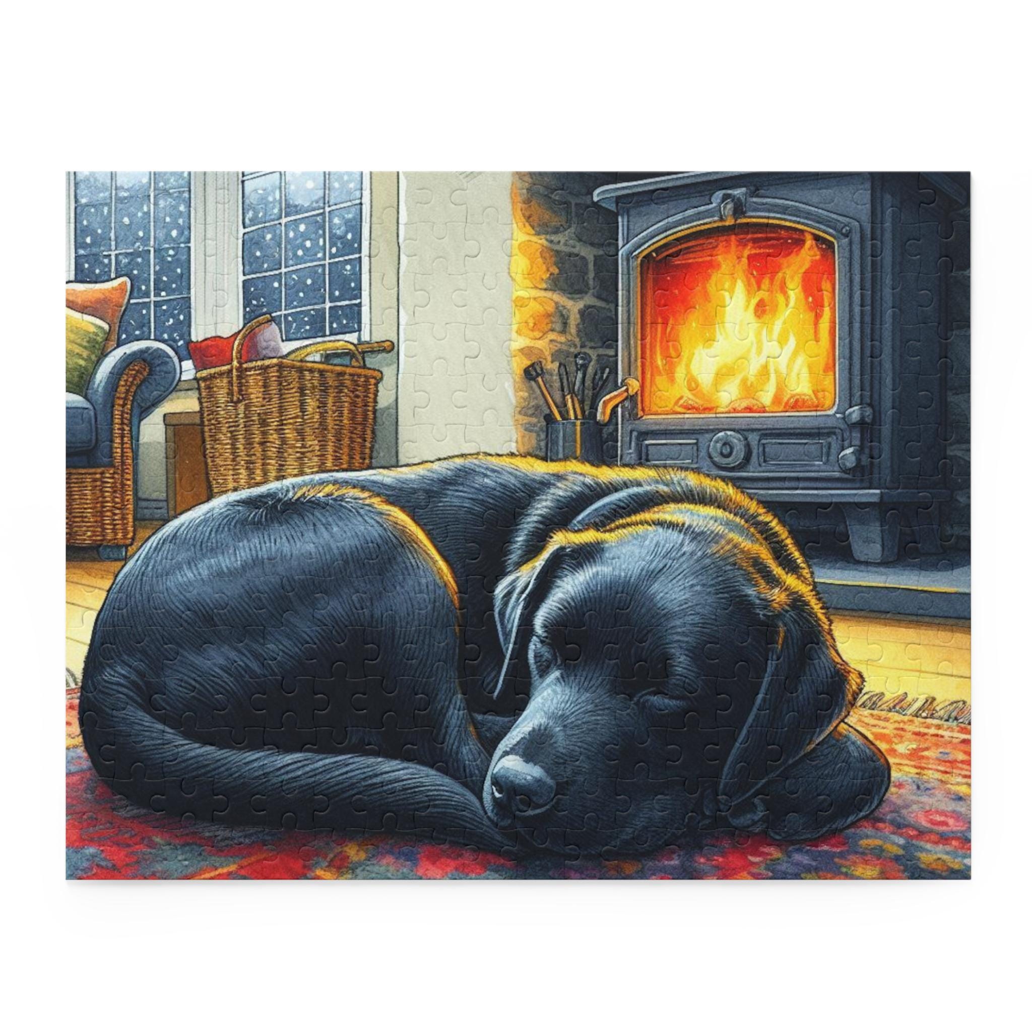 "This fabulous new jigsaw puzzle features a tired Black Labrador snoozing in front a wood burne...