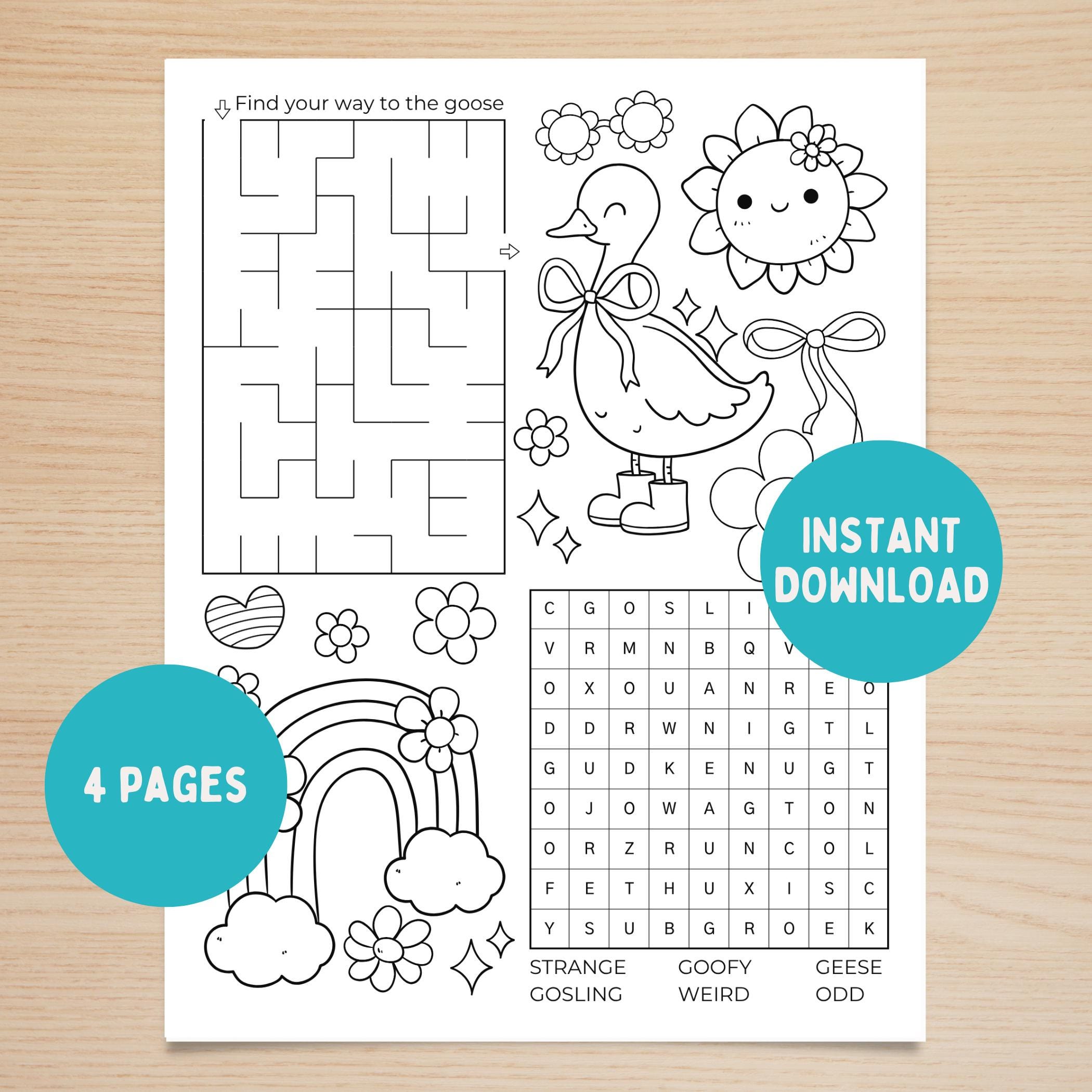 "These silly goose themed coloring and puzzle activity sheets are great for keeping kids occupi...