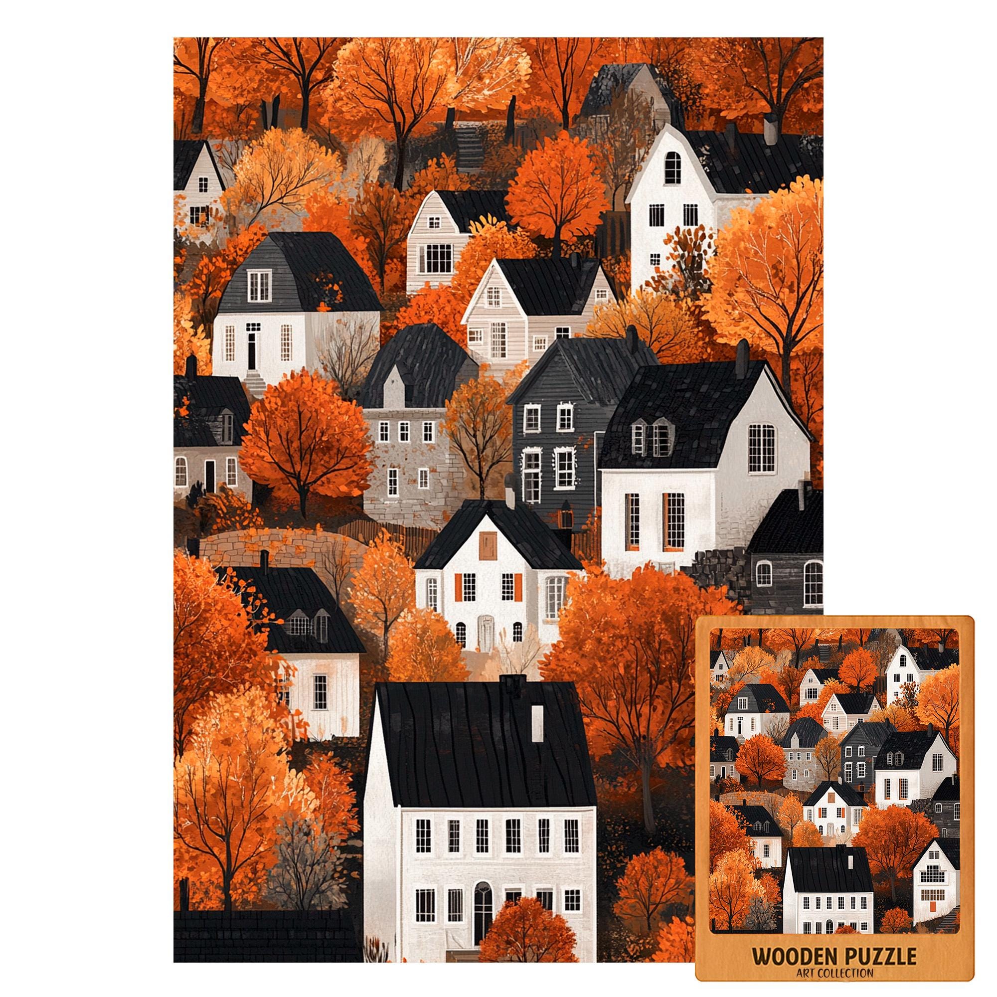 Fall Village Wooden Puzzle - Cozy Cottage Scene with Orange Autumn ...