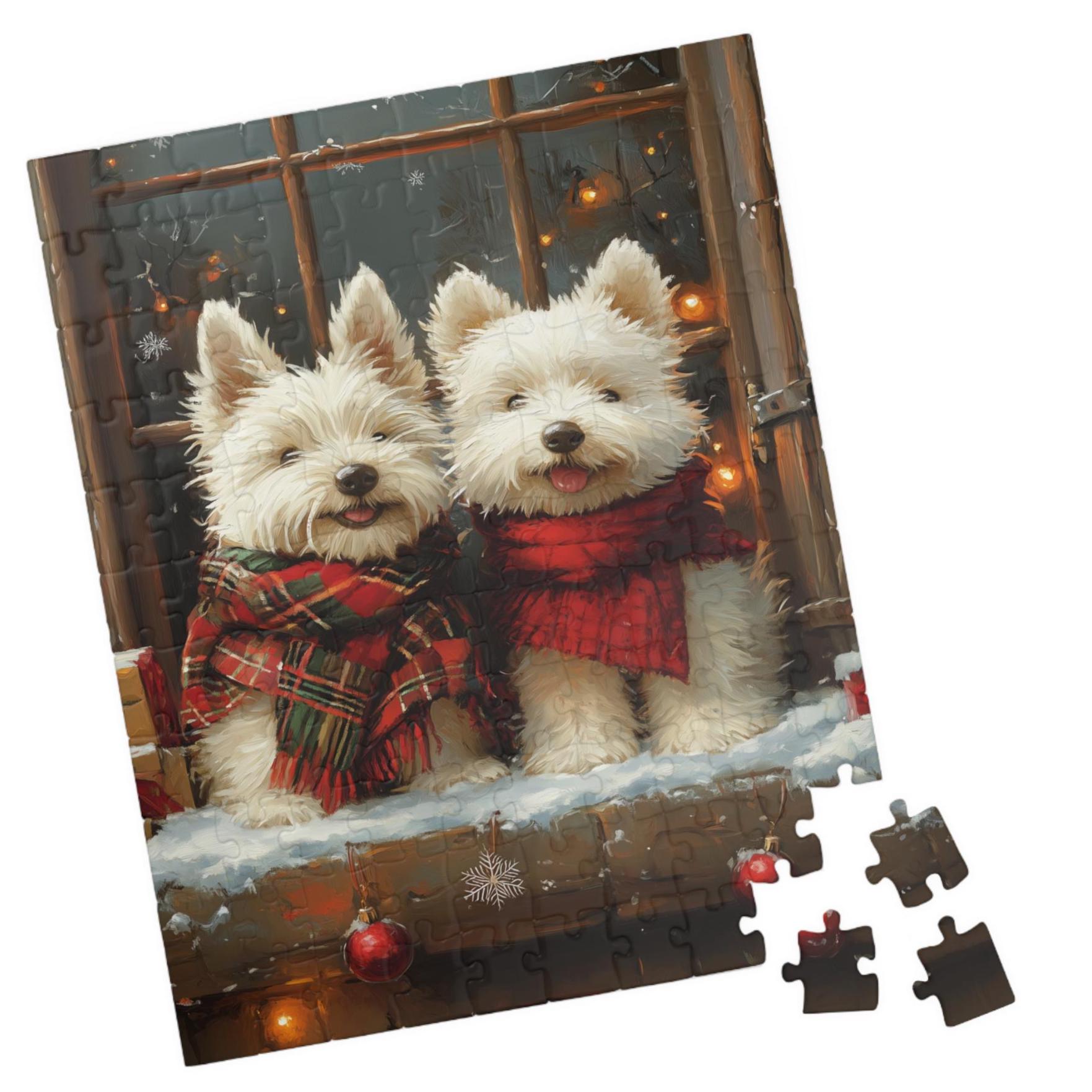 Christmas Westie Puzzle, Snowy Holiday Dogs in Scarves Jigsaw, Whim...