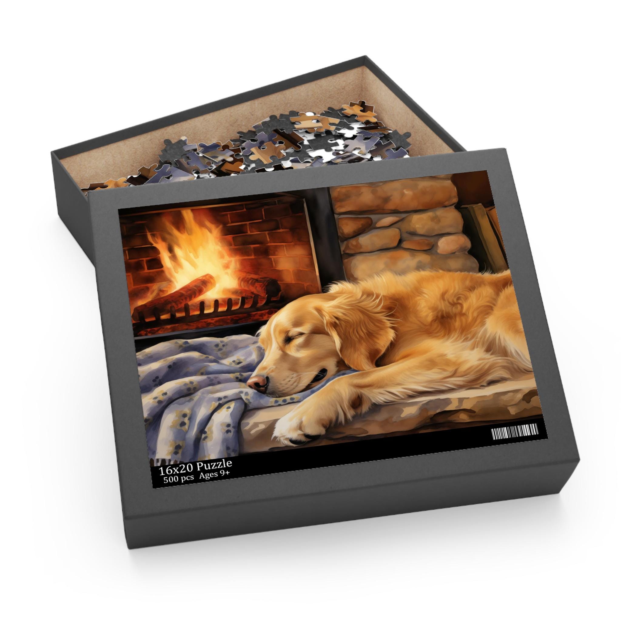 "Relax and unwind with this heartwarming jigsaw puzzle featuring a serene scene of a golden ret...