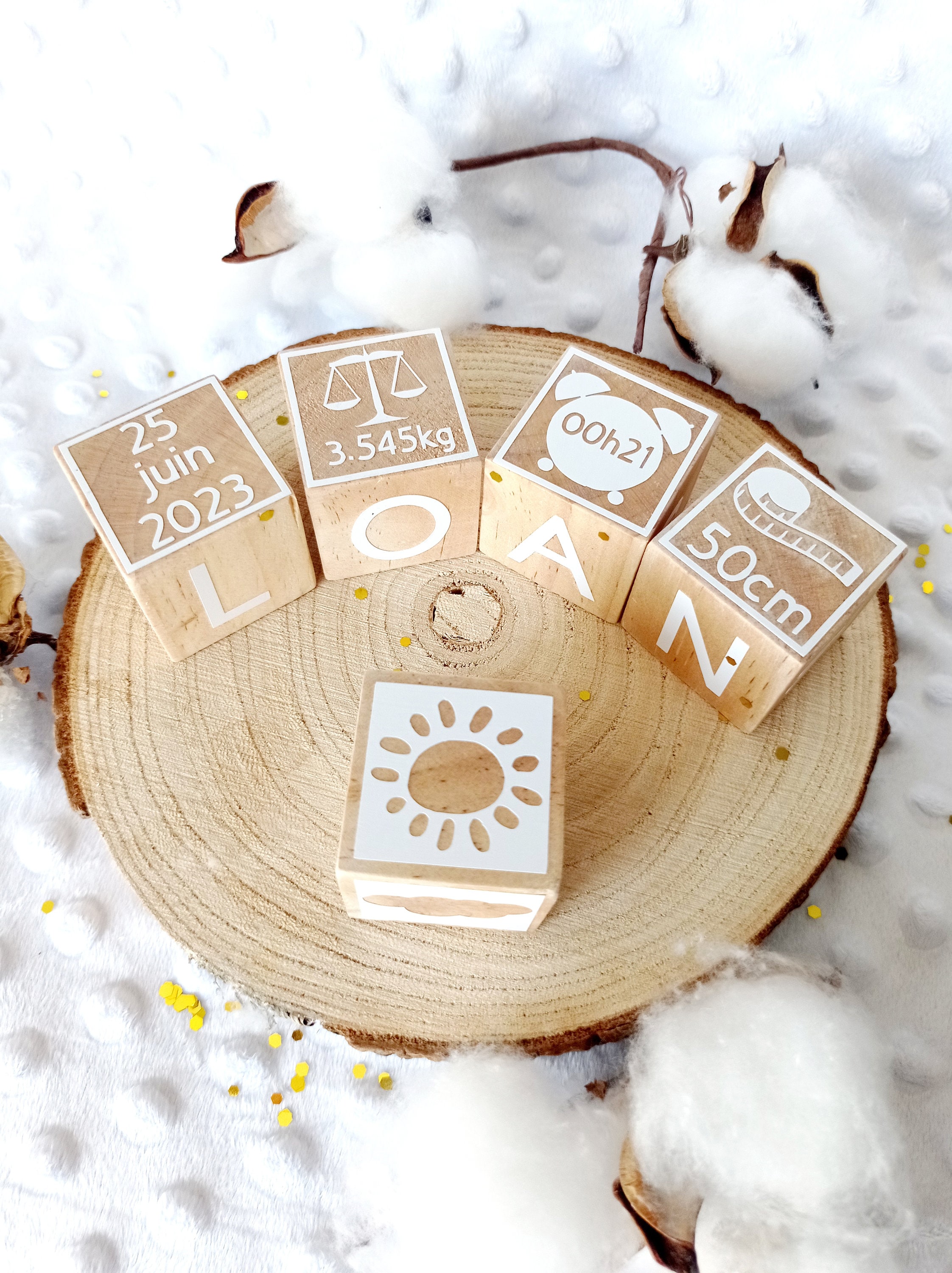 "Pretty little wooden cube personalized with the baby's name. Material used, heat-adhesive viny...