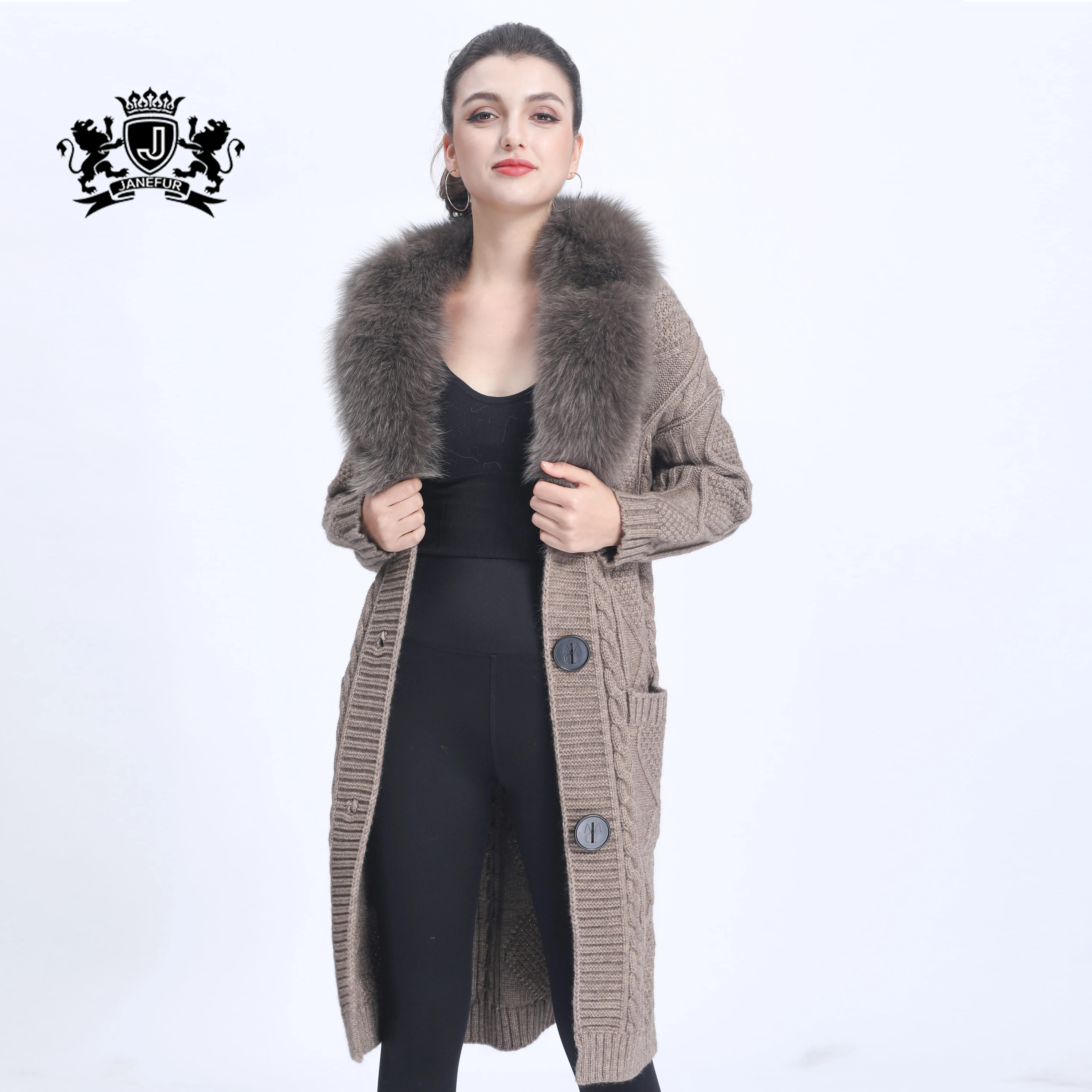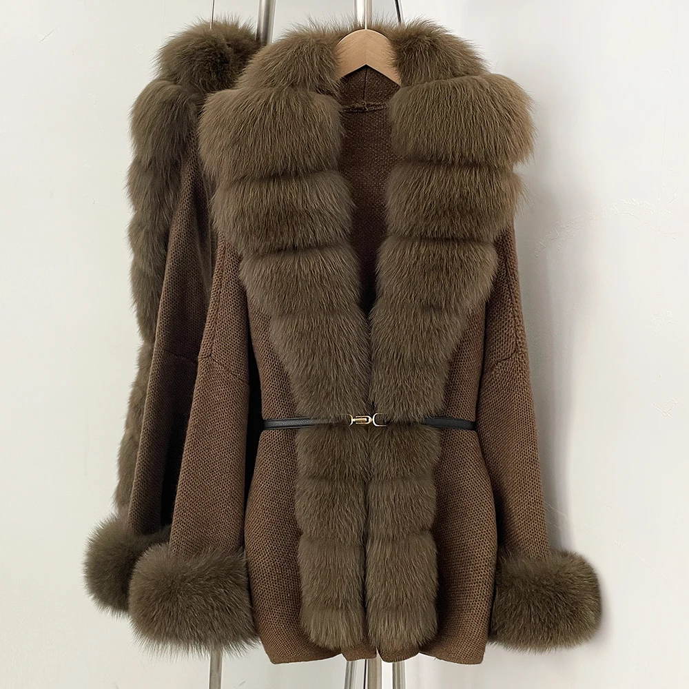 OFTBUY New Women's Knit Coat with Large Real Fox Fur Belt Textured ...