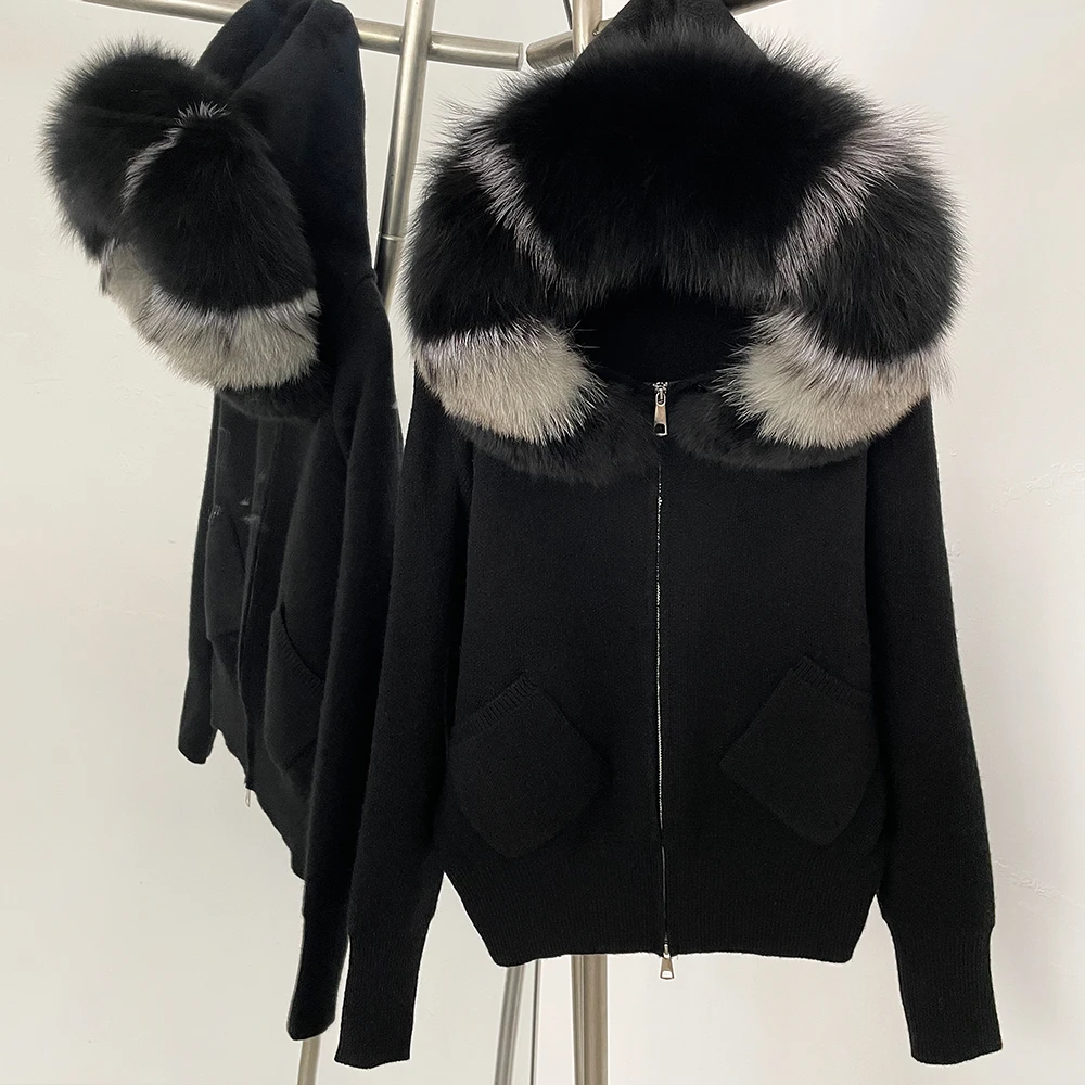 Cardigan Fashion Autumn Winter Clothes Female Hooded Big Real Fox F...