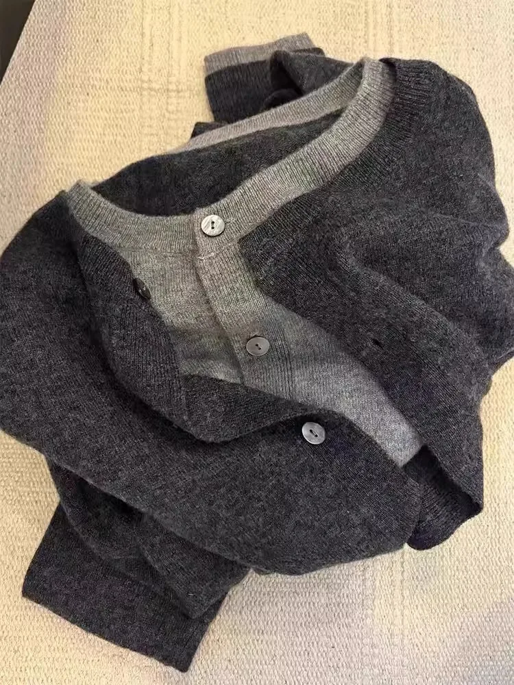 Fake two 100% pure cashmere sweater cardigan dark grey high-grade wool knit coat top