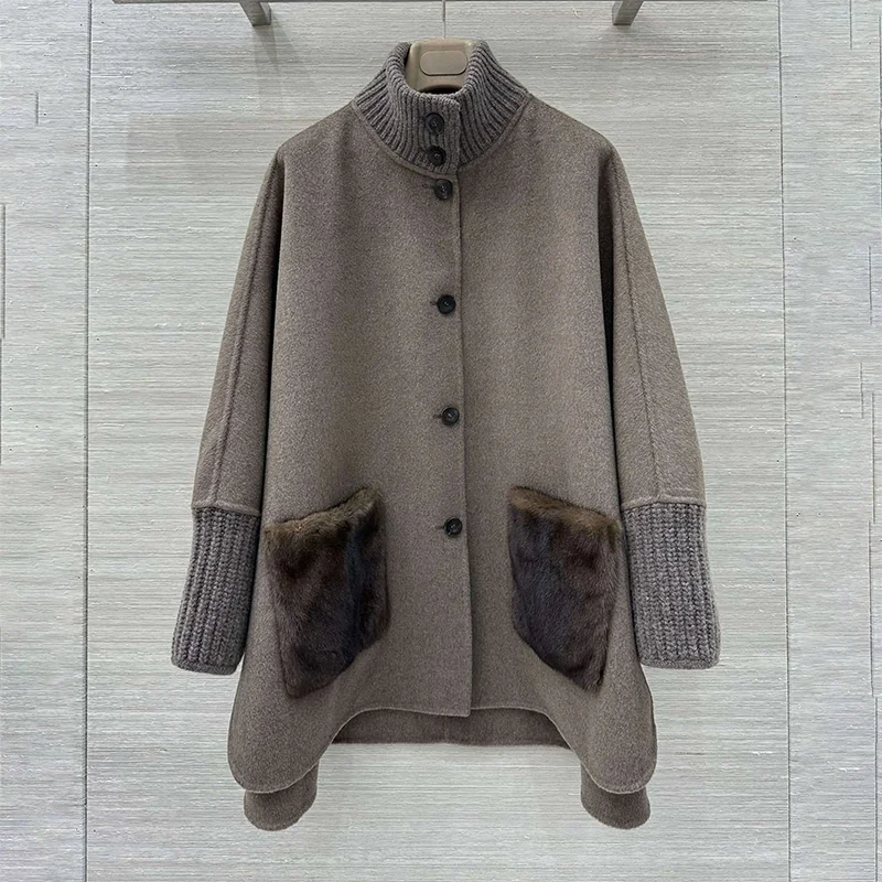 High-quality women's knitted stand-up collar double-faced cashmere wool coat with long sleeves and w...