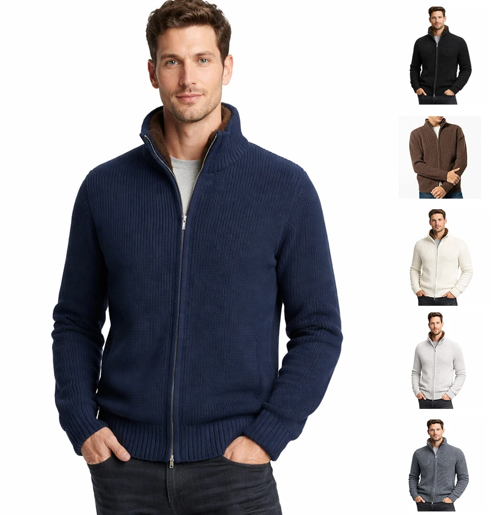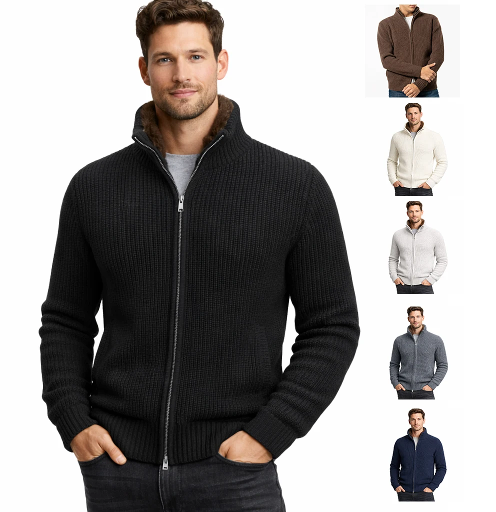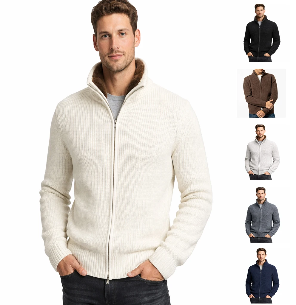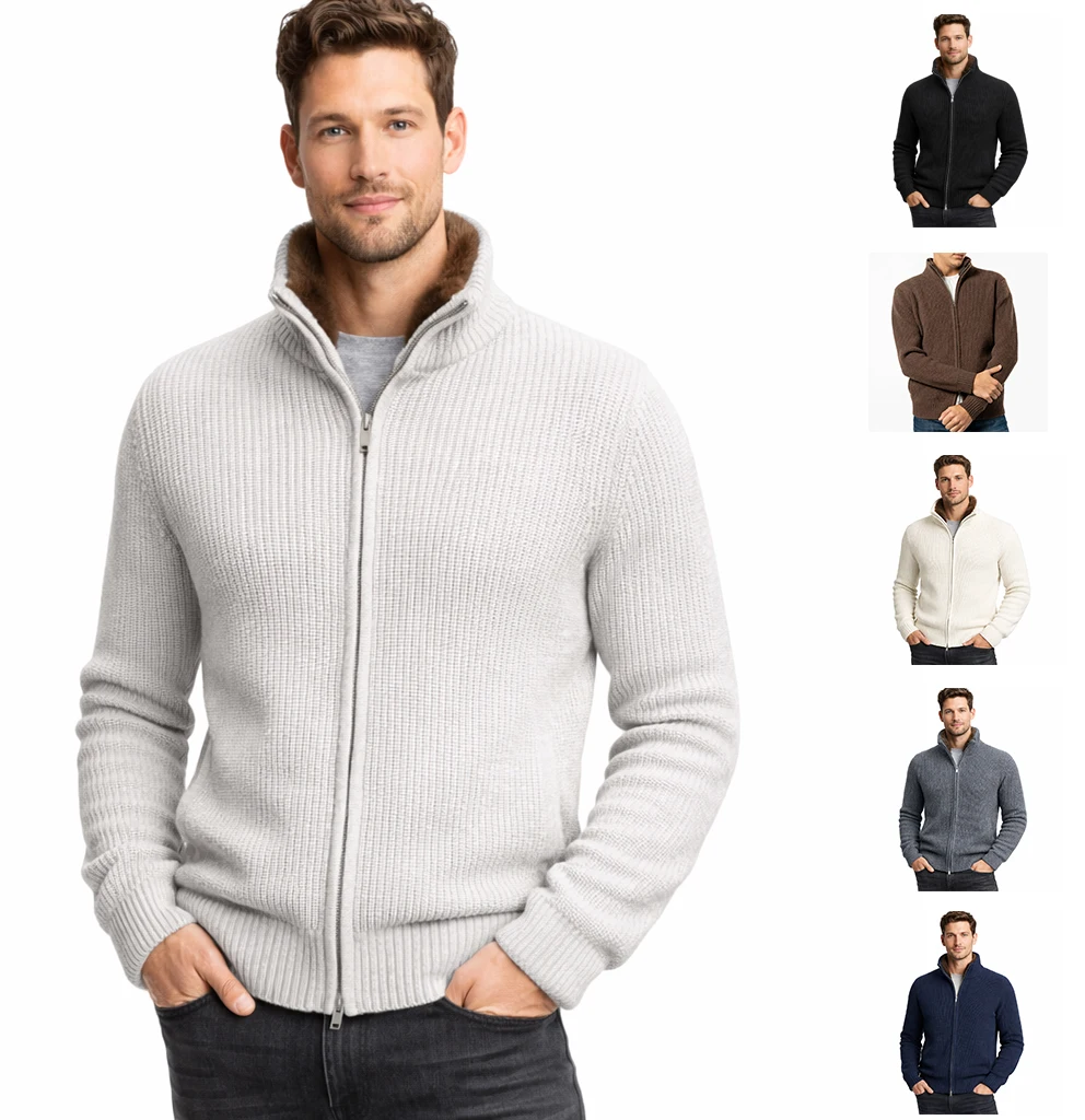 Men's Cashmere Wool Double Zip Jacket in Creamy Heavy Rib Knit Bomb...