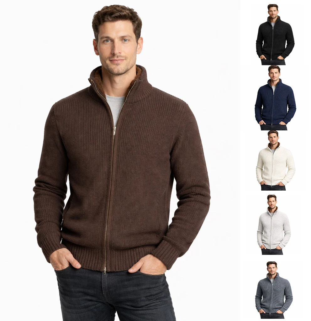 Men's Cashmere Wool Double Zip Jacket in Brown Heavy Rib Knit Bombe...