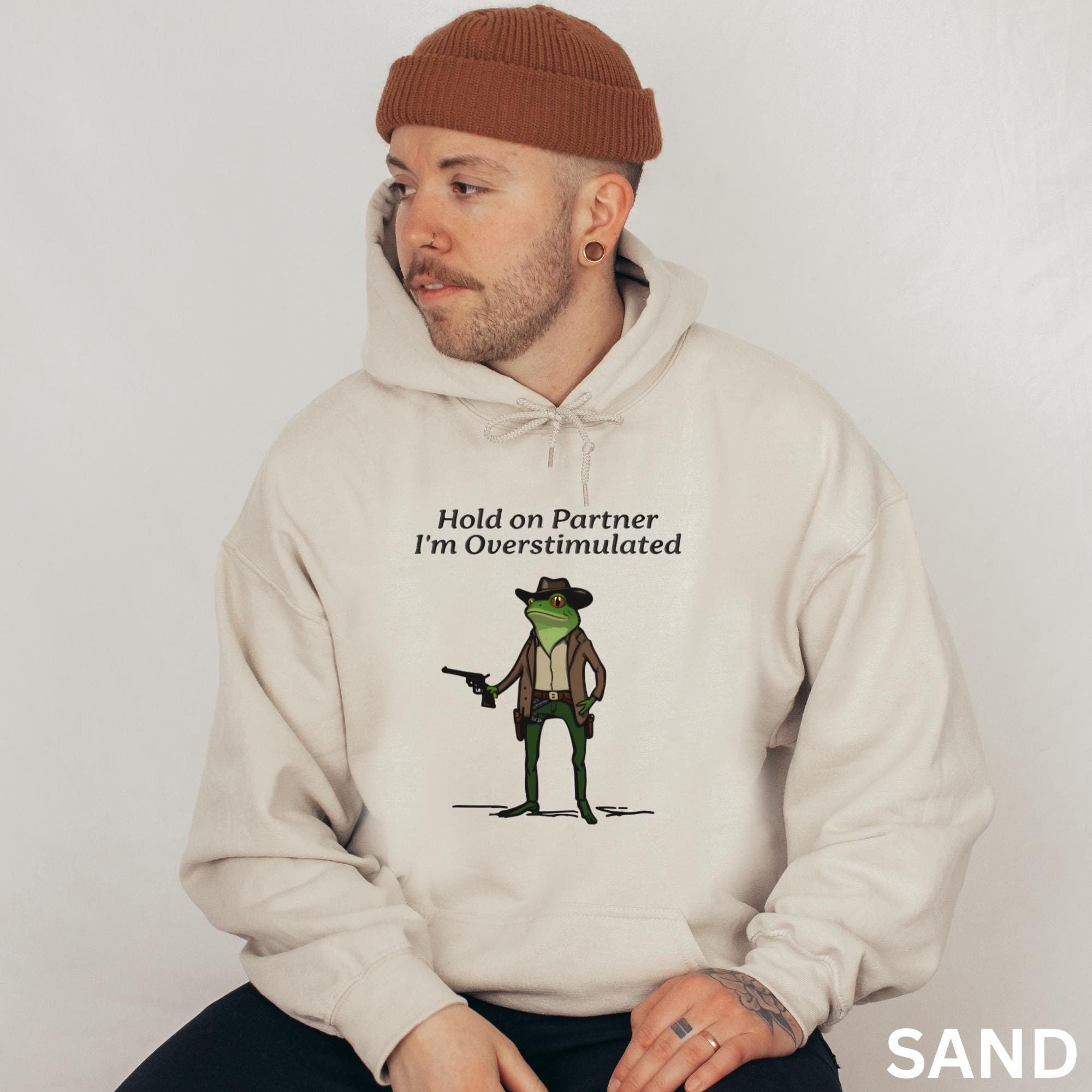 "Trendy Graphic Funny Hoodie For Men Hold On Partner I'm Overstimulated Frog Hoodie, Overstimul...