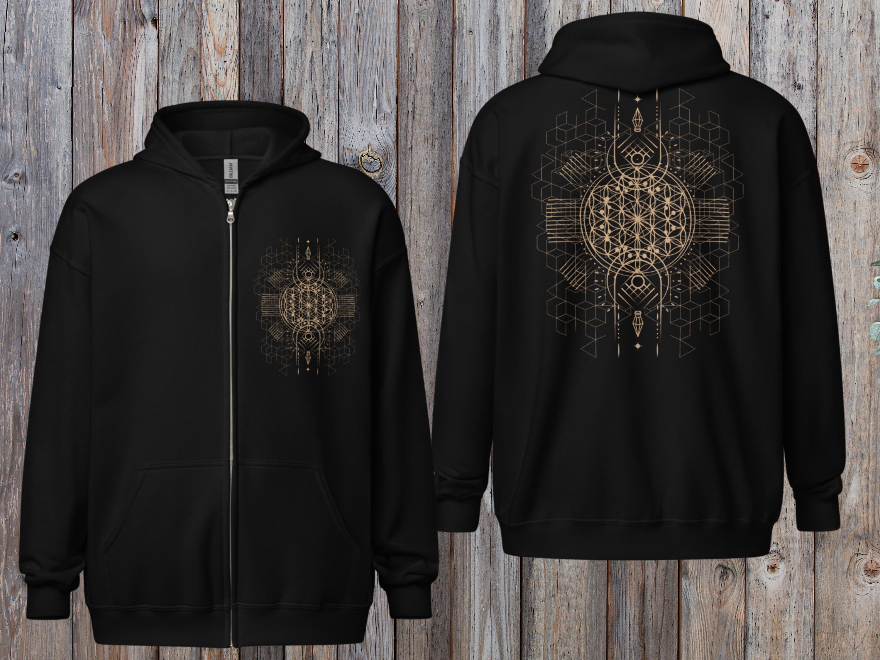 This Flower of Life zip up hoodie features a timeless sacred geometry symbol representing creation, ...