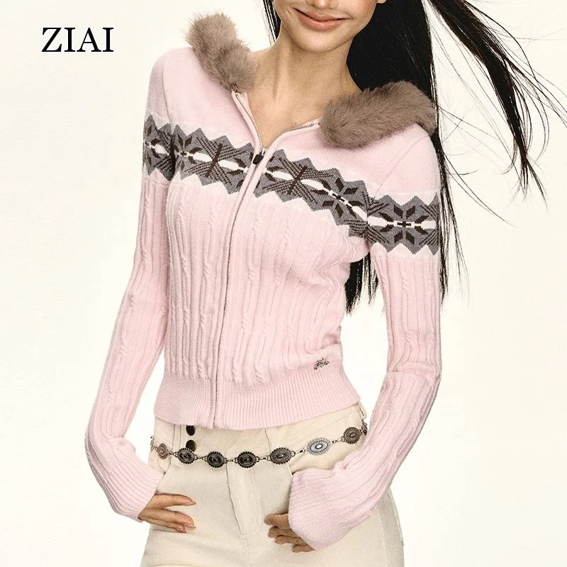 High End Chic Design Zipper Sweater Jacket Women Short Jacquard Long Sleeve Knitted Sweater Coat Fem...