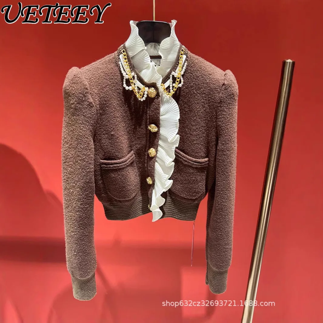 Autumn and Winter New Ruffle Edge Knitted Cardigan Sweater Temperament Retro Beaded Stand-up Collar ...