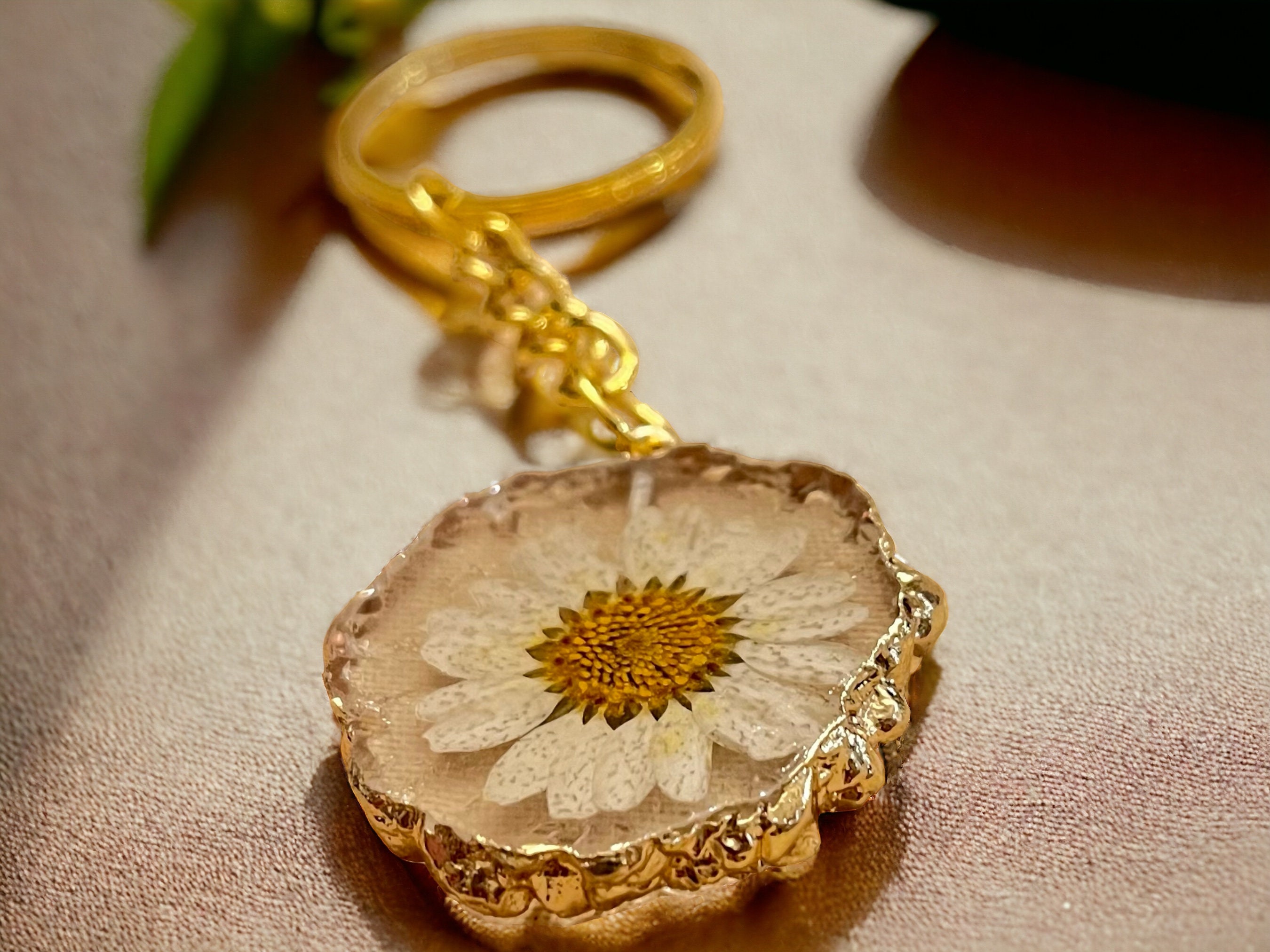 Real Pressed Daisy Resin Keyring. Gold keyring, Pressed flower keyr...