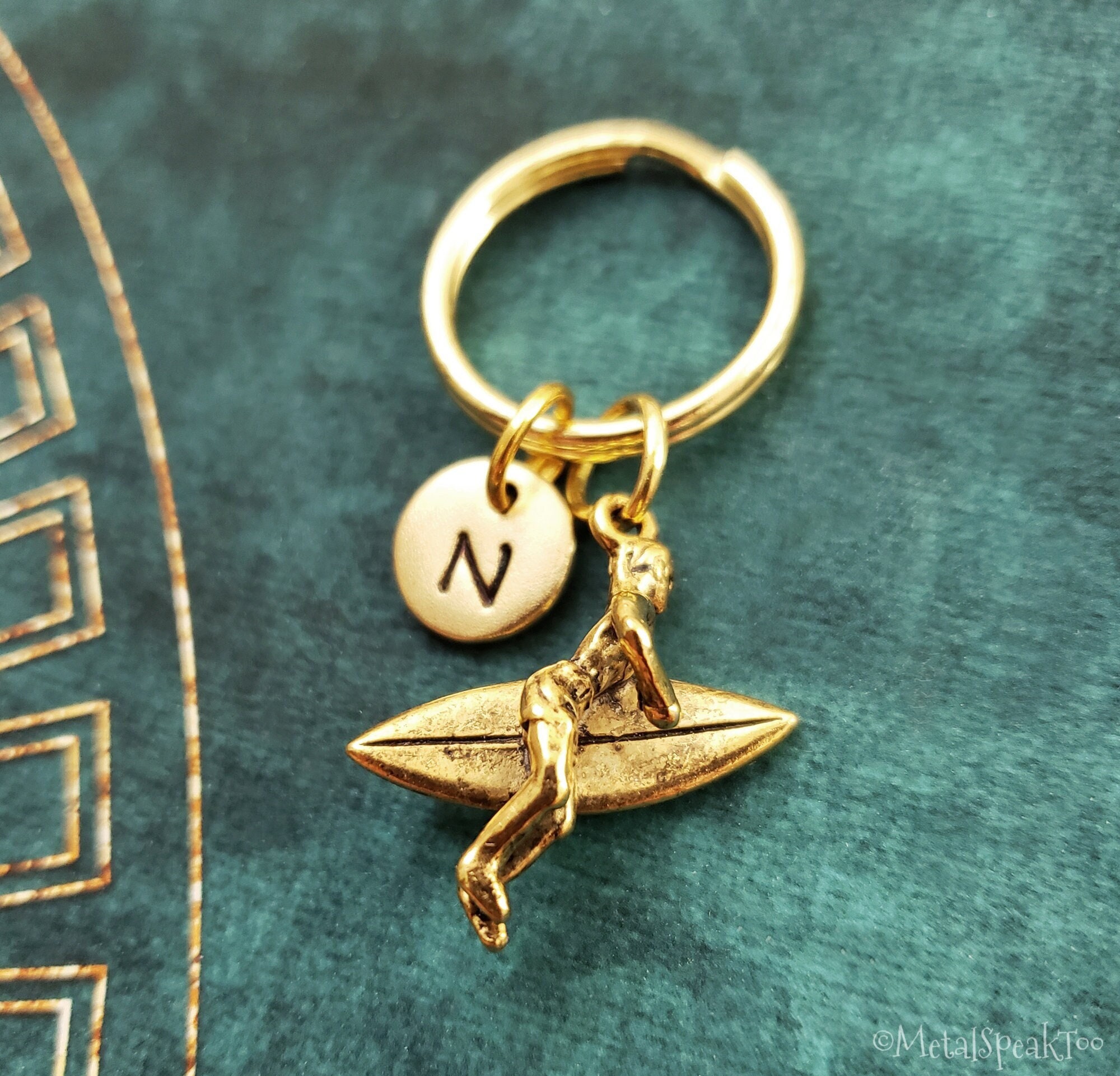 "This listing is for a personalized paddle board keychain with a hand-stamped initial charm. We...