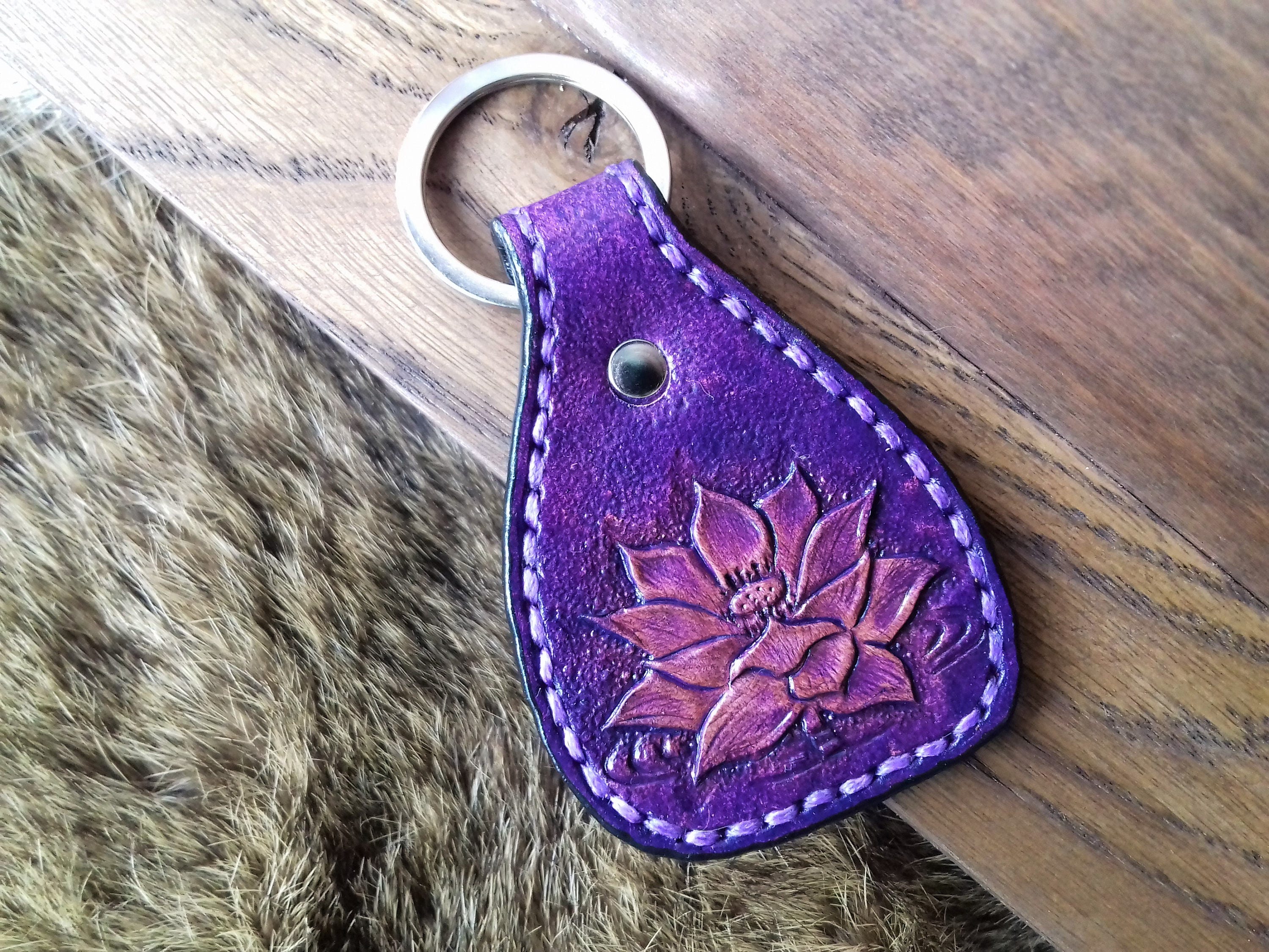 Keychain, Floral Leather Keychain, Flower key fob, purple Leather Keychain, Custom Leather Keyfob, P...