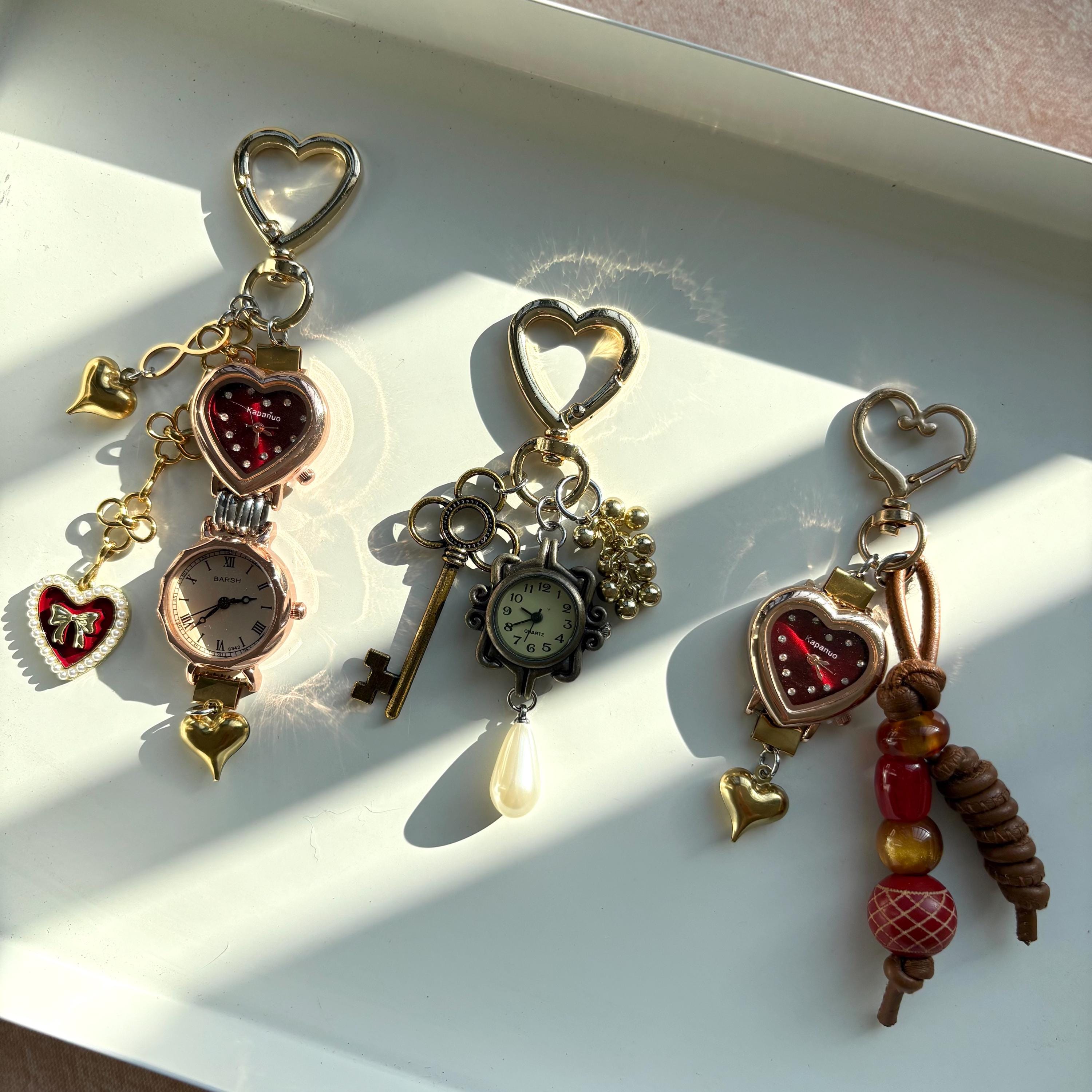Vintage gold watch keychain,red heart watch bag accessory,pearl wat...