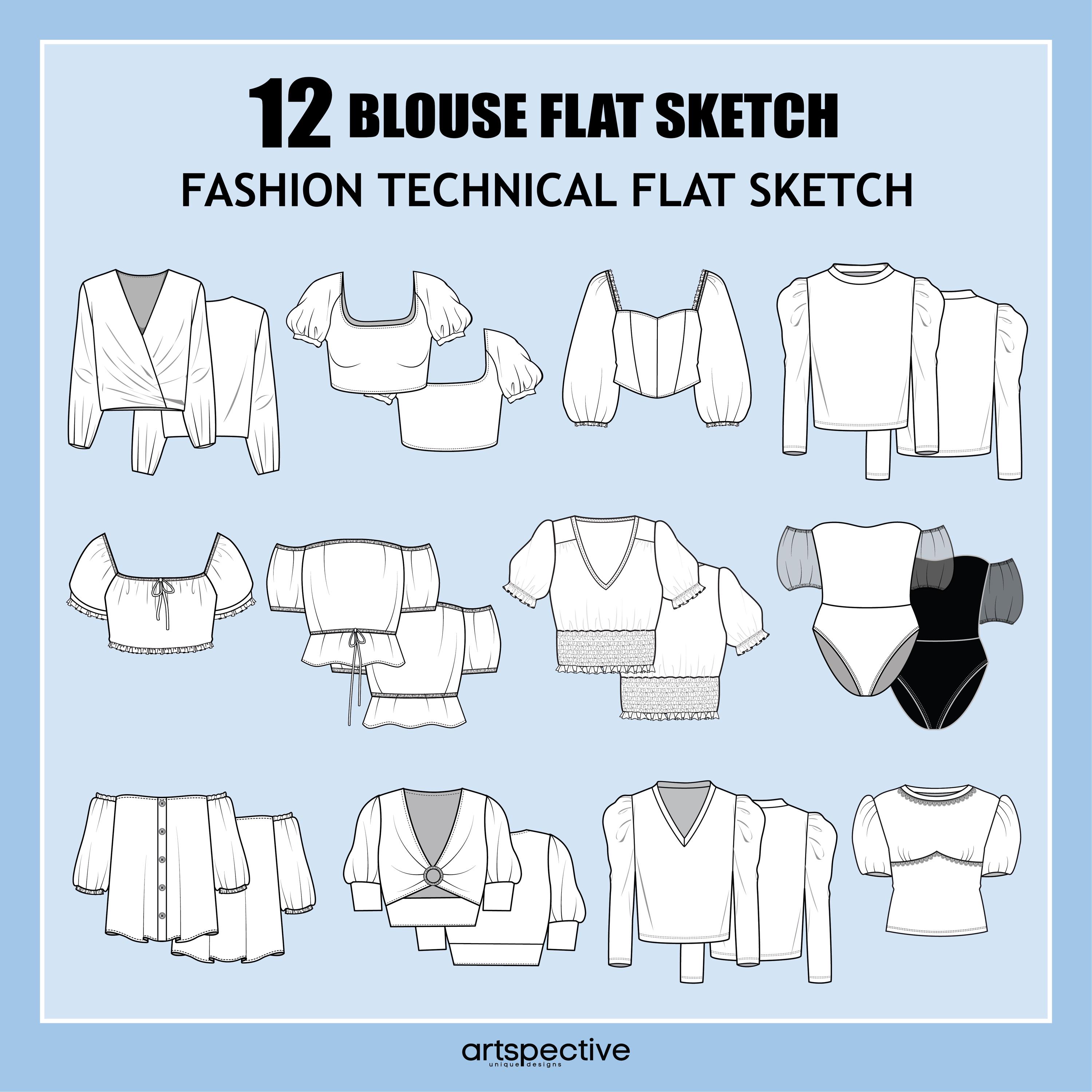 Womens 12 pcs Puff Sleeve Blouses Fashion Flat Sketch - Fashion Vec...