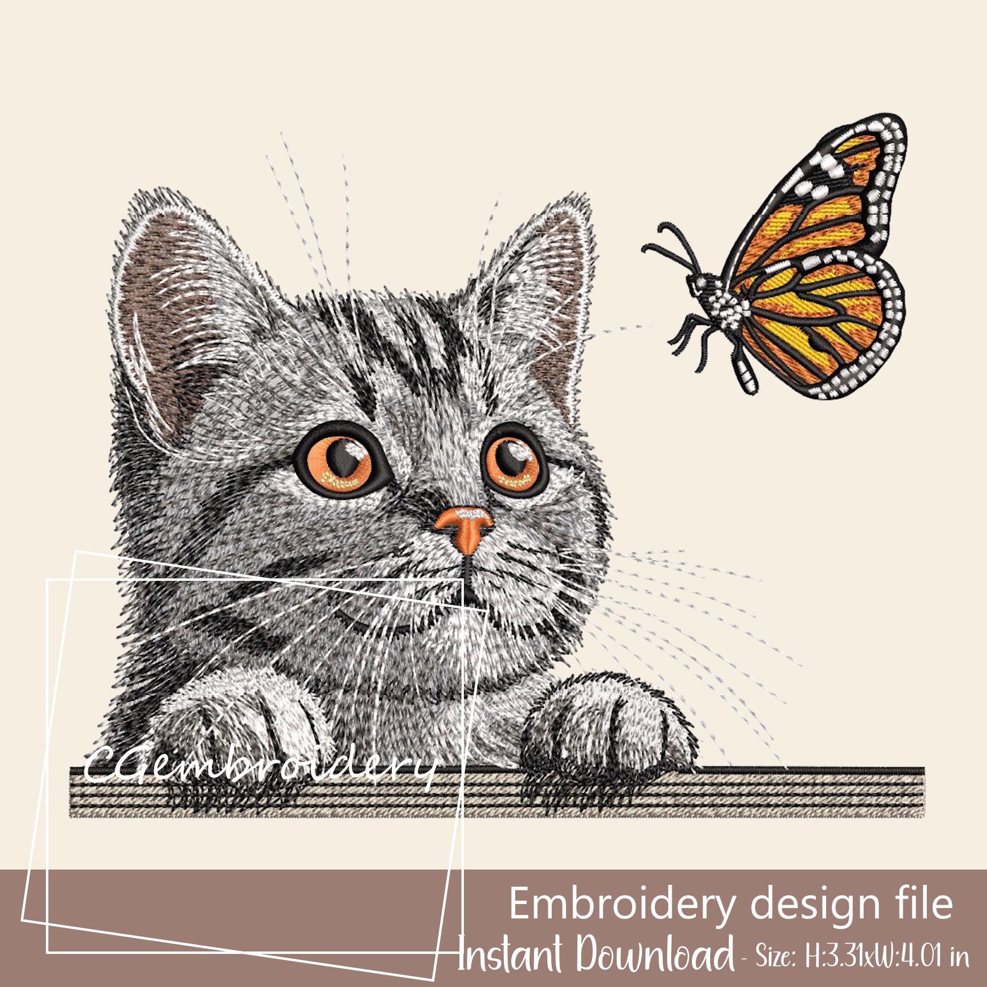 Cat Embroidery Design, Cat and Butterfly Embroidery, Cat Peeking Ca...