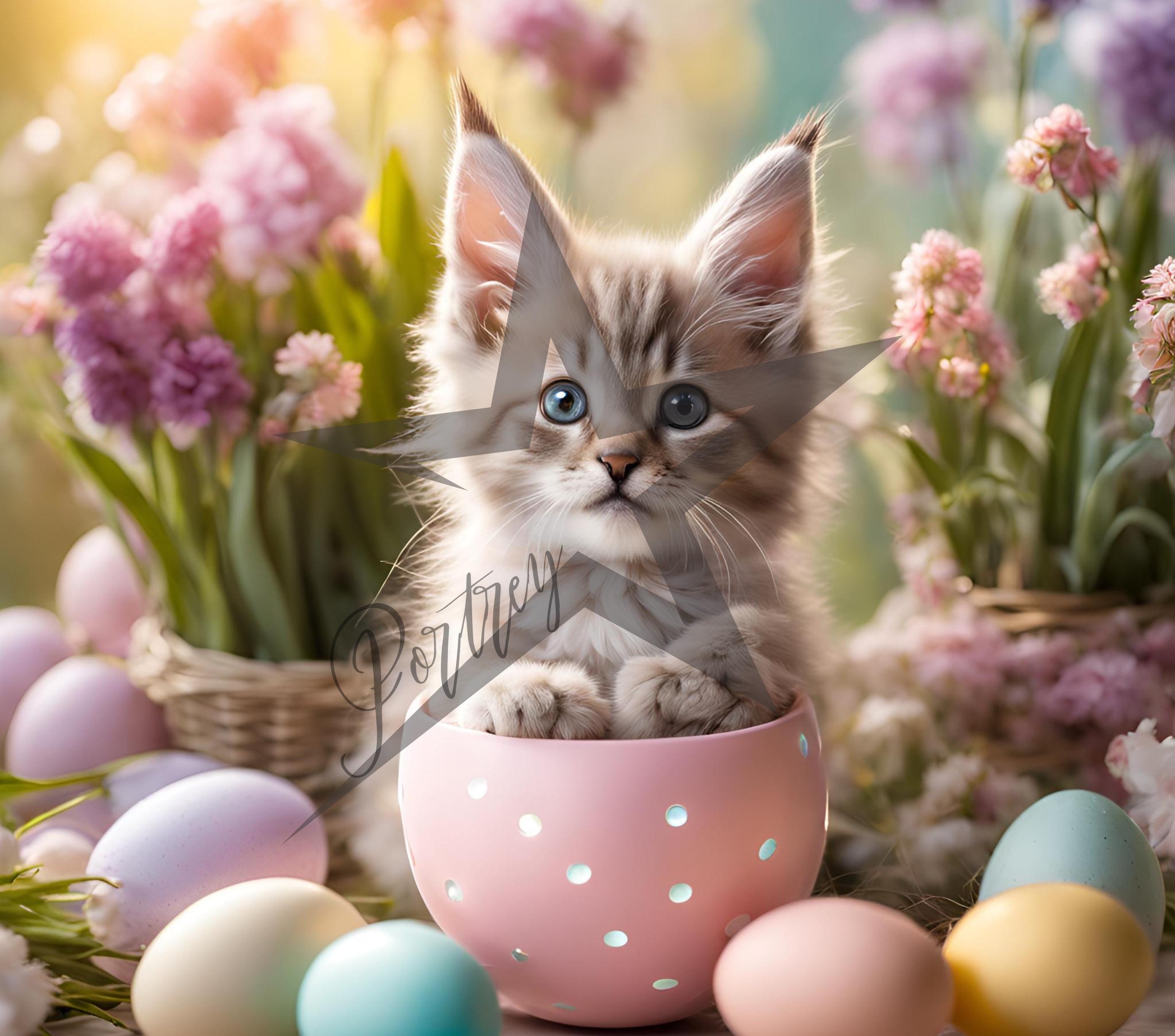 Cute Kitty Kitten Cat Fur Mama Baby in Easter Cup Eggs Flowers Spri...