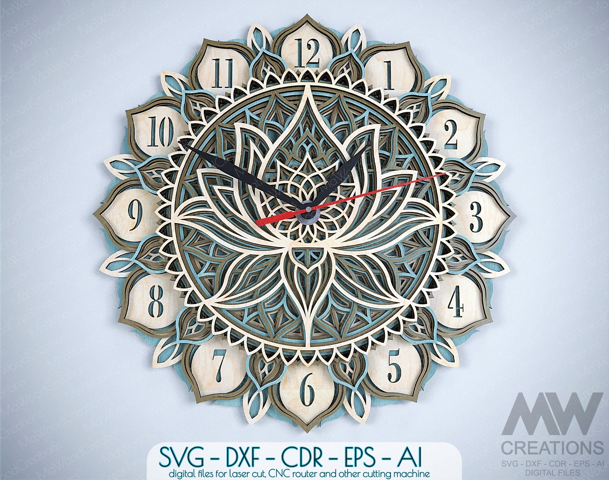 Laser cut Clock SVG Dxf, Layered Lotus Mandala Clock Svg, Multi-lay...