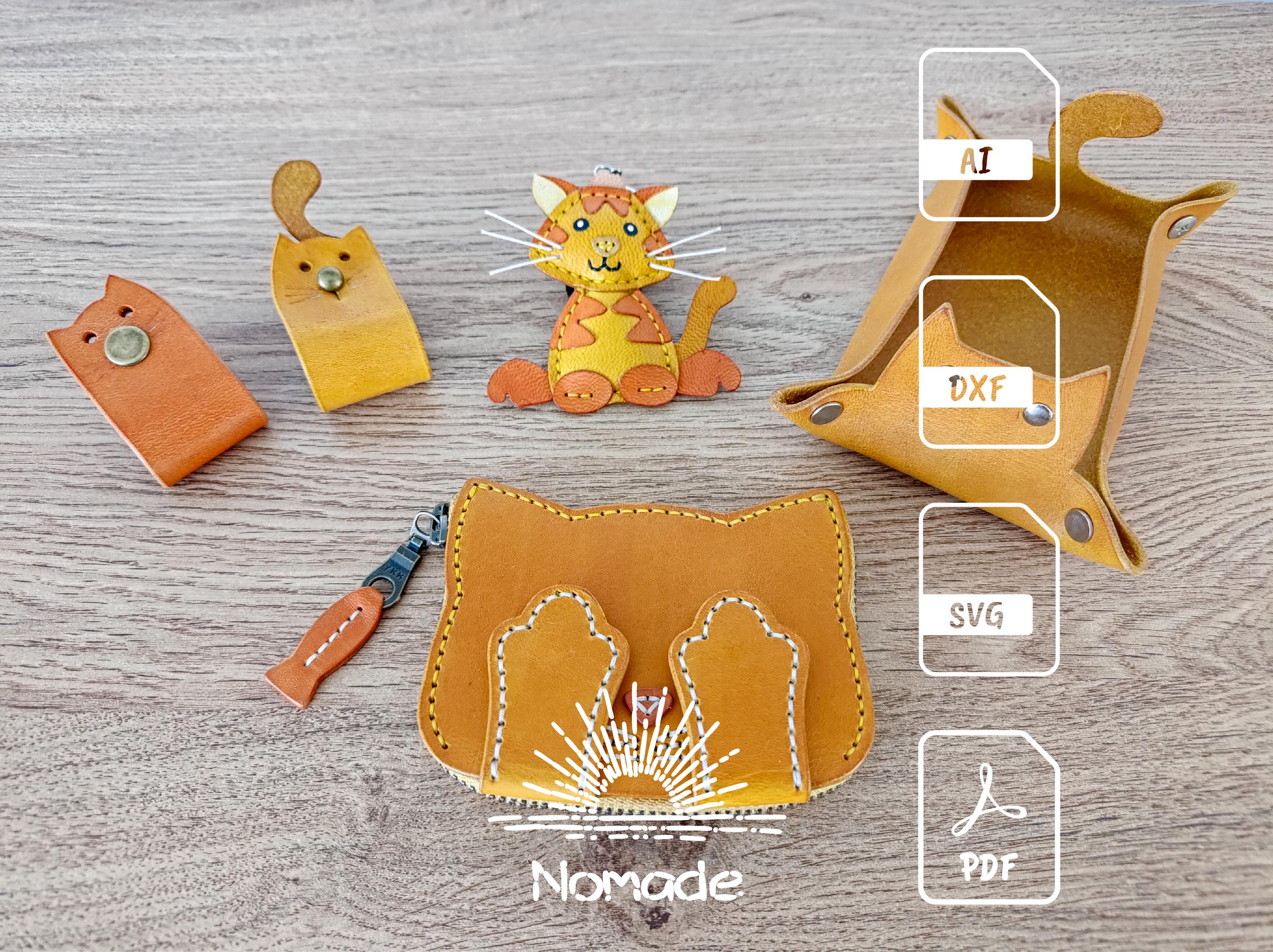 4 Cat Themed Leather Patterns: Coin Purse, Charm, Tray, and Cable O...